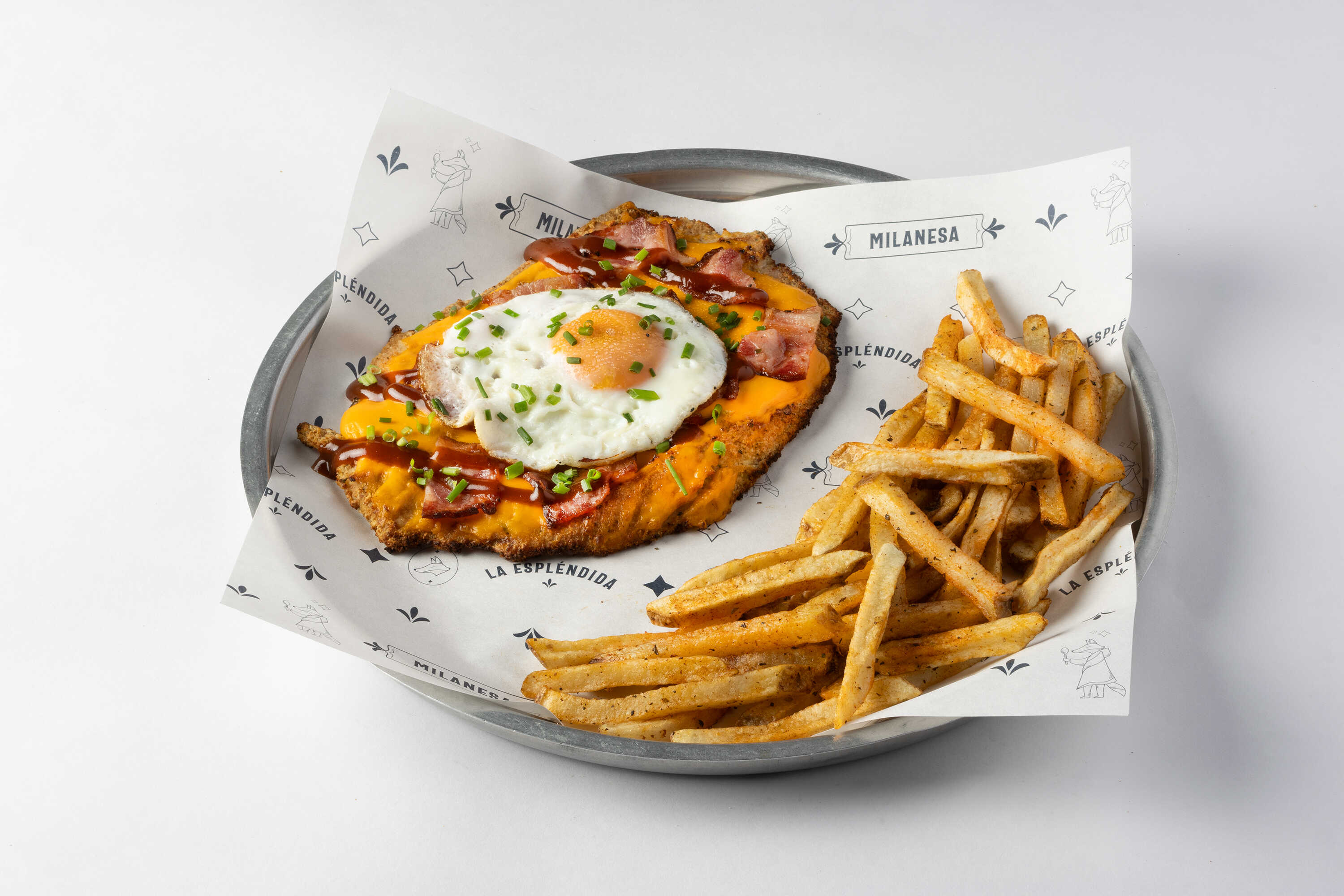 Milanesa al horno con proteína a tu elección,cerdo y res queso cheddar, tocineta, salsa bbq, ciboullete y huevo frito acompañado de 200g de papa francesa. .