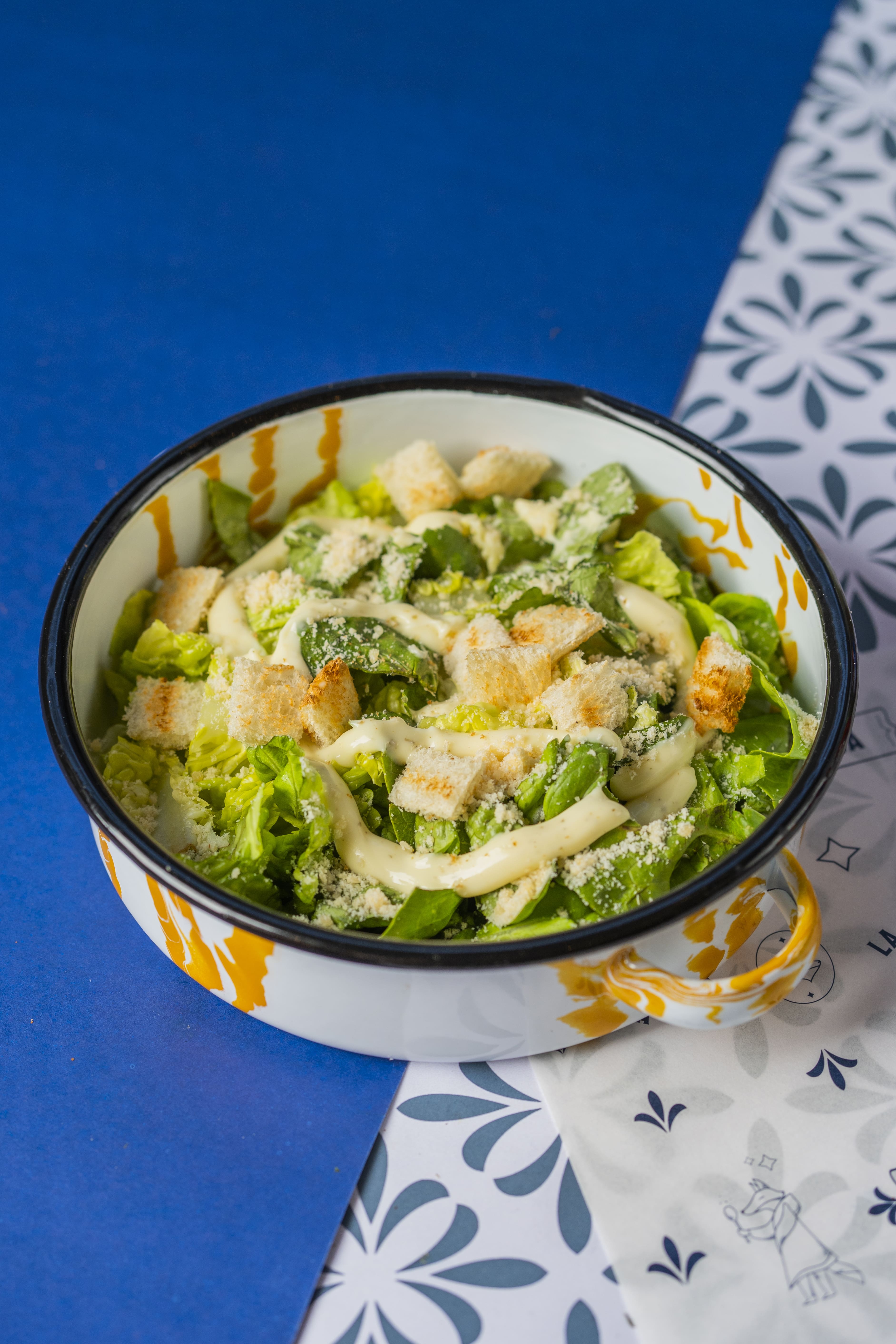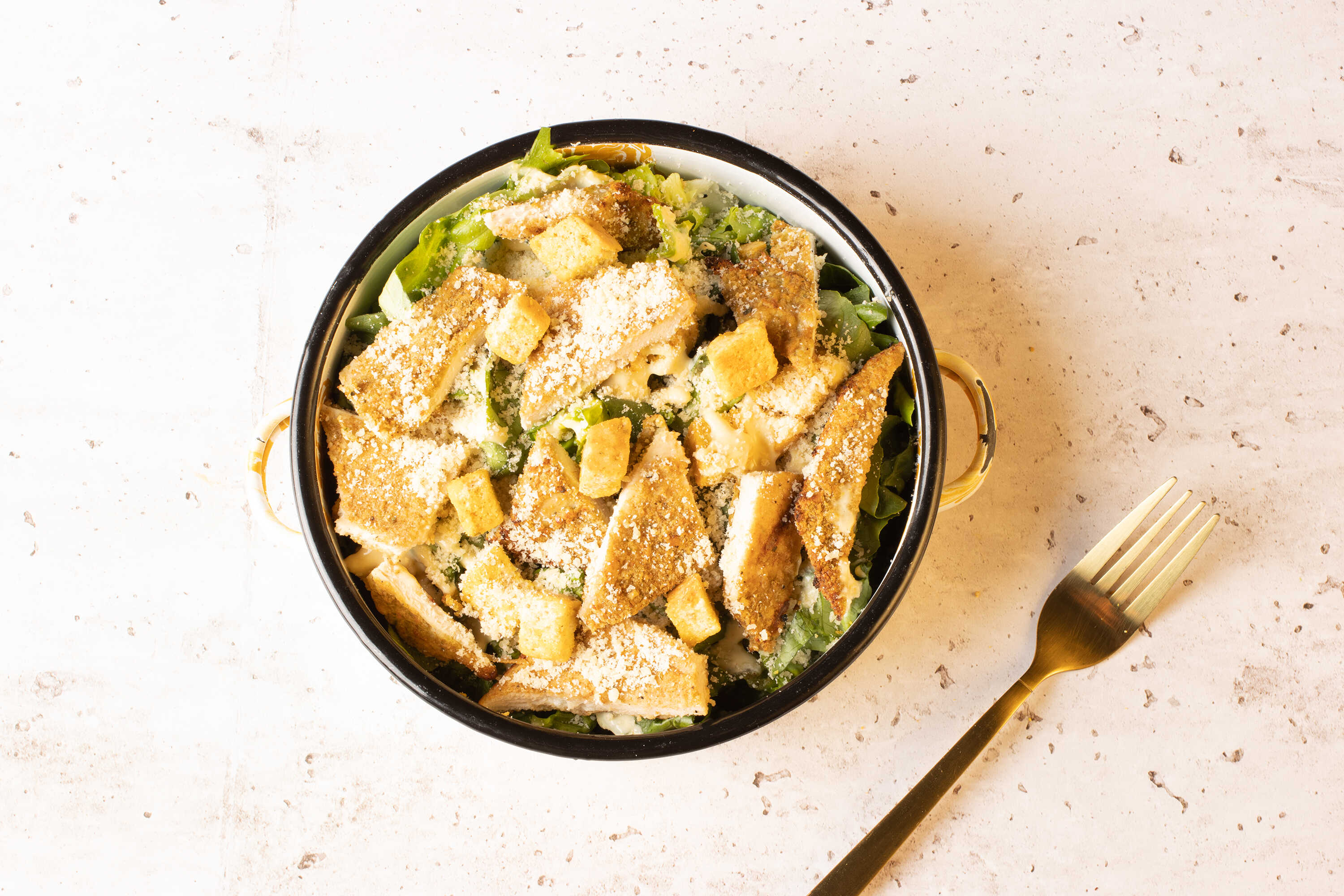 Cogollos con salsa caesar, parmesano, crutones y milanesa de pollo (120 gr).