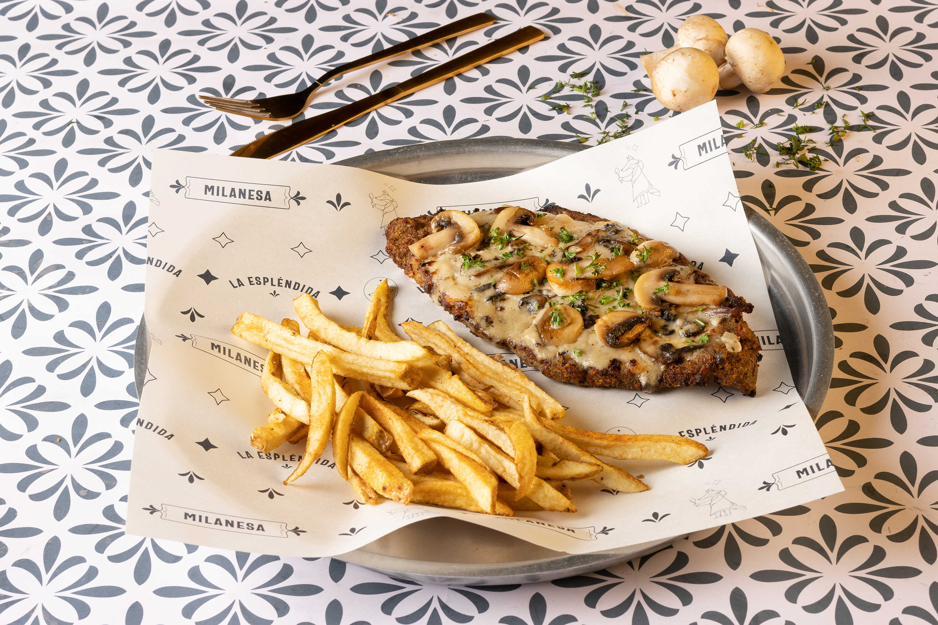 Milanesa al horno con proteína a tu elección, queso mozzarella, salsa de champiñones y perejil fresco acompañado con 200g de papa francesa.