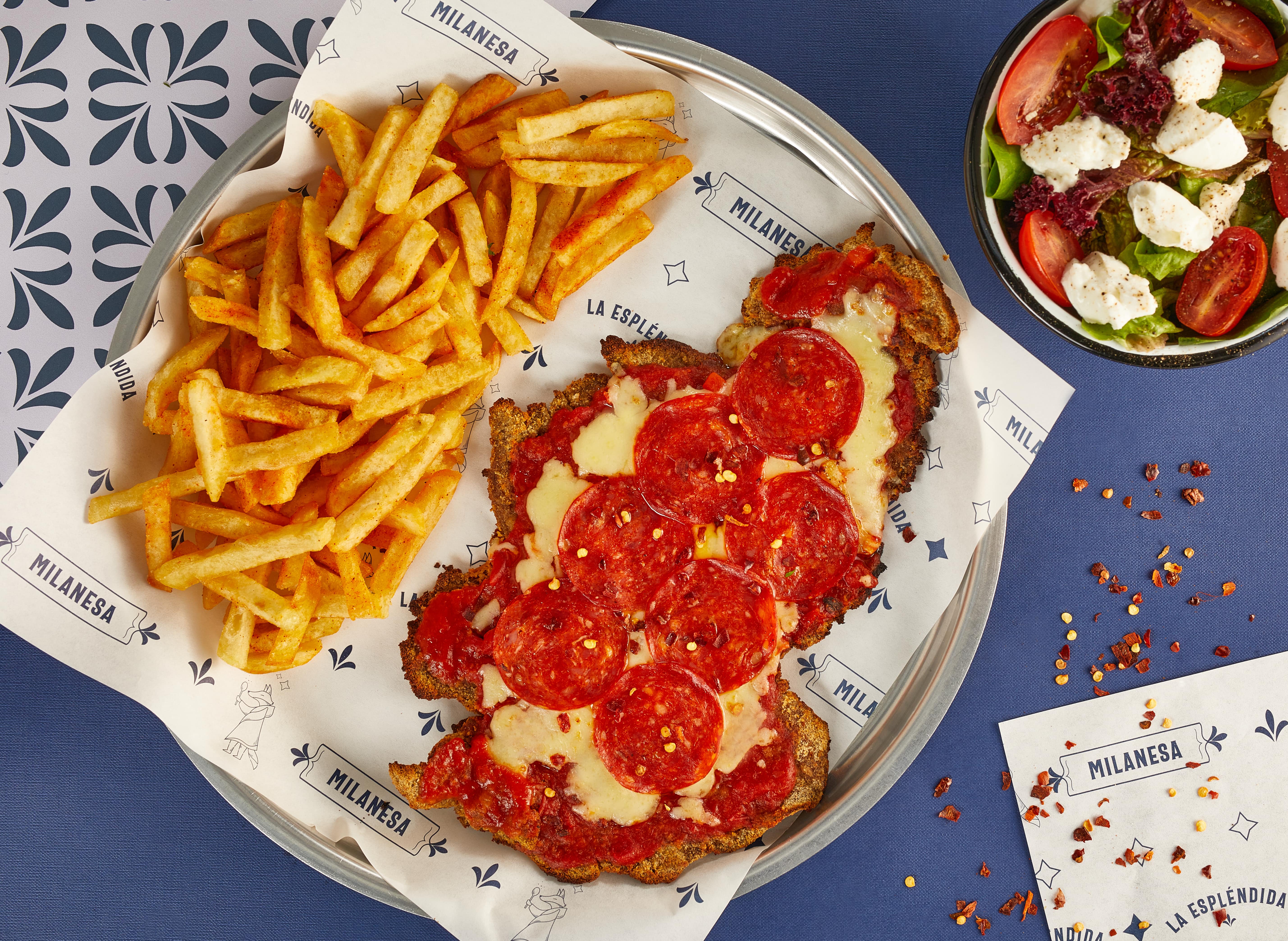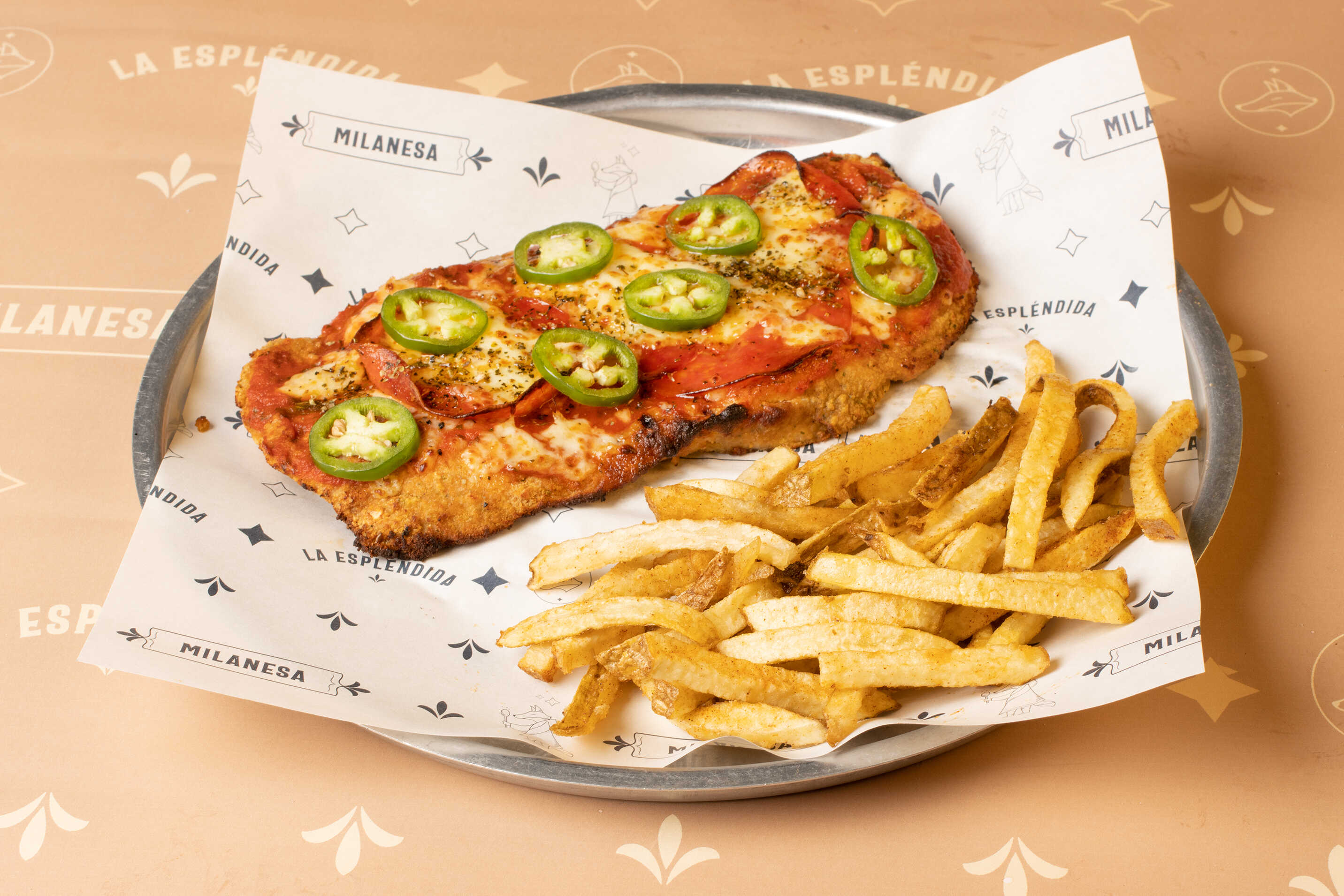 Milanesa al horno con proteína a tu elección, queso mozzarella, salsa napolitana, pepperoni, orégano y aceite de pepperoncino acompañado de 200g de papa francesa. .