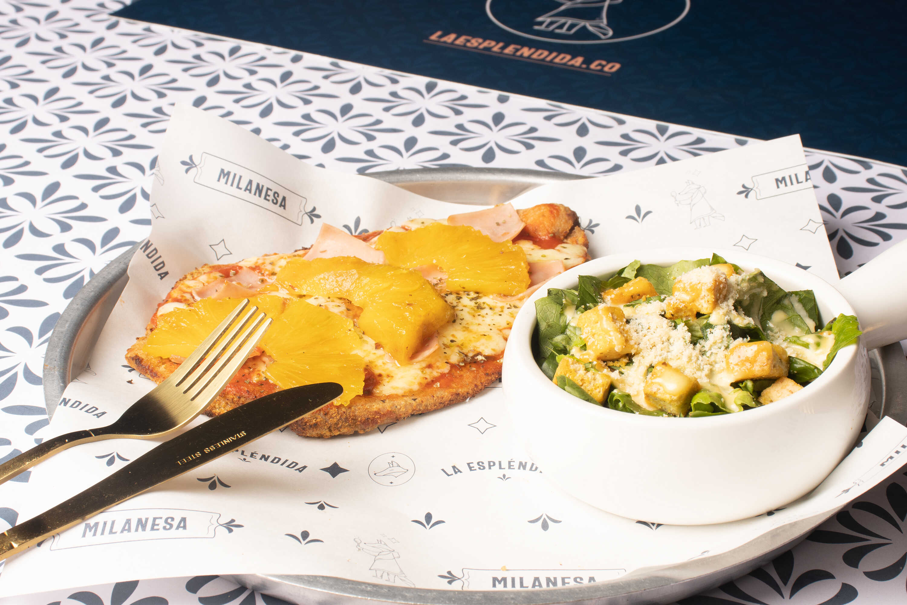 Milanesa al horno con proteína a tu elección, queso mozarella, salsa napolitana, jamon y piña acompañado con 200g de papa francesa .