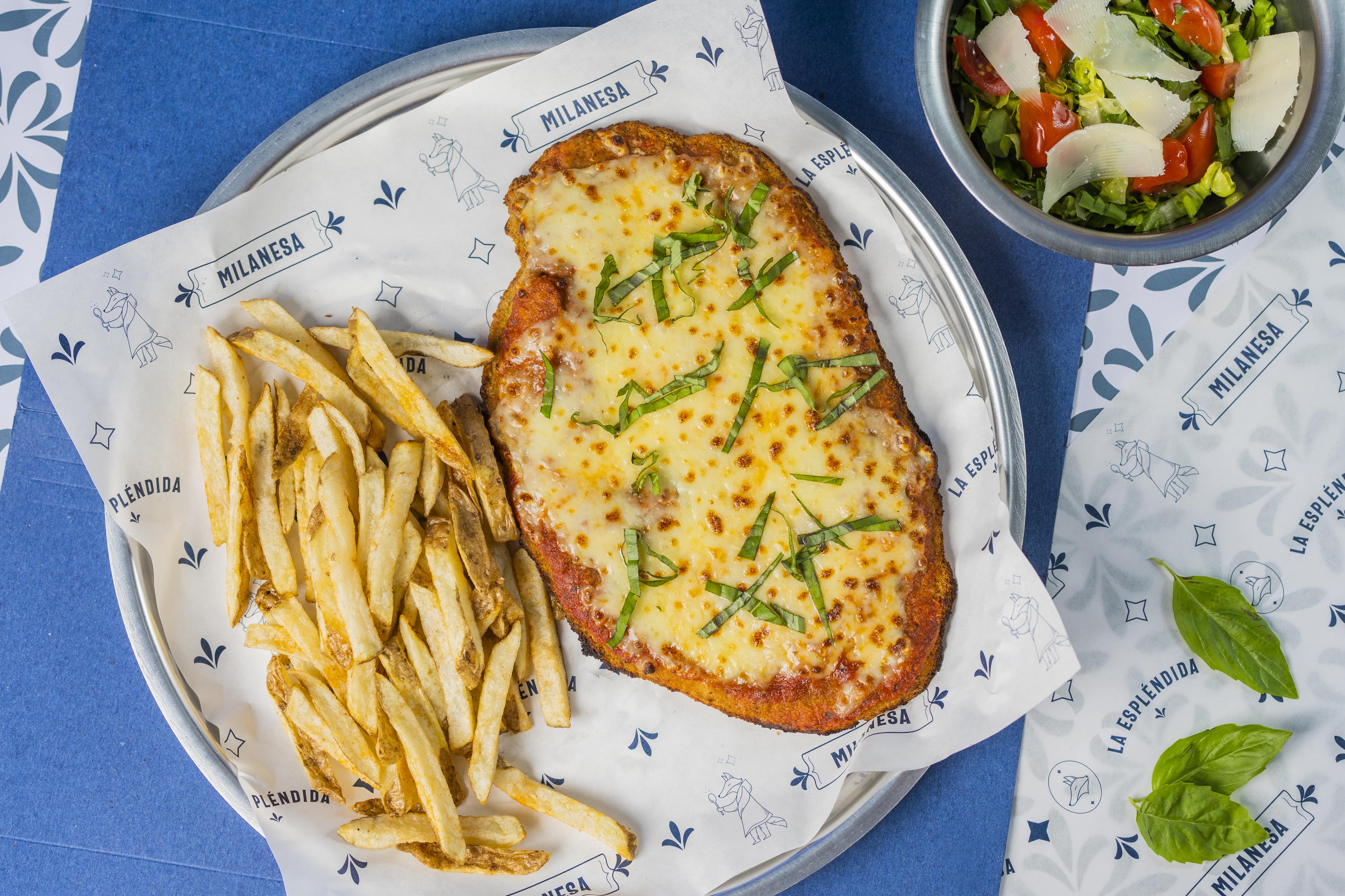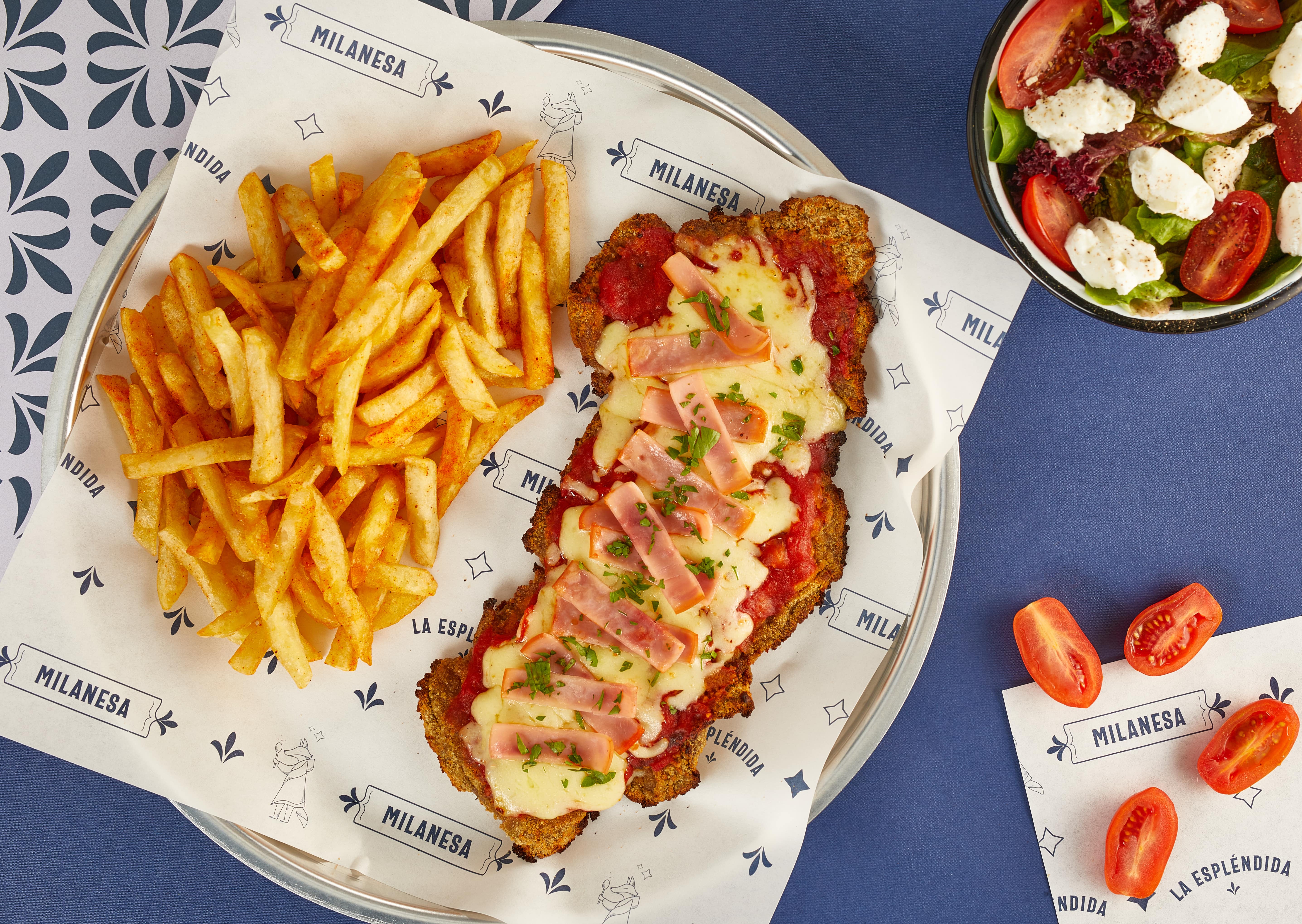 Milanesa al horno con proteína a tu elección, queso mozarella, salsa napolitana, jamón y orégano acompañado de 200g de papa francesa.