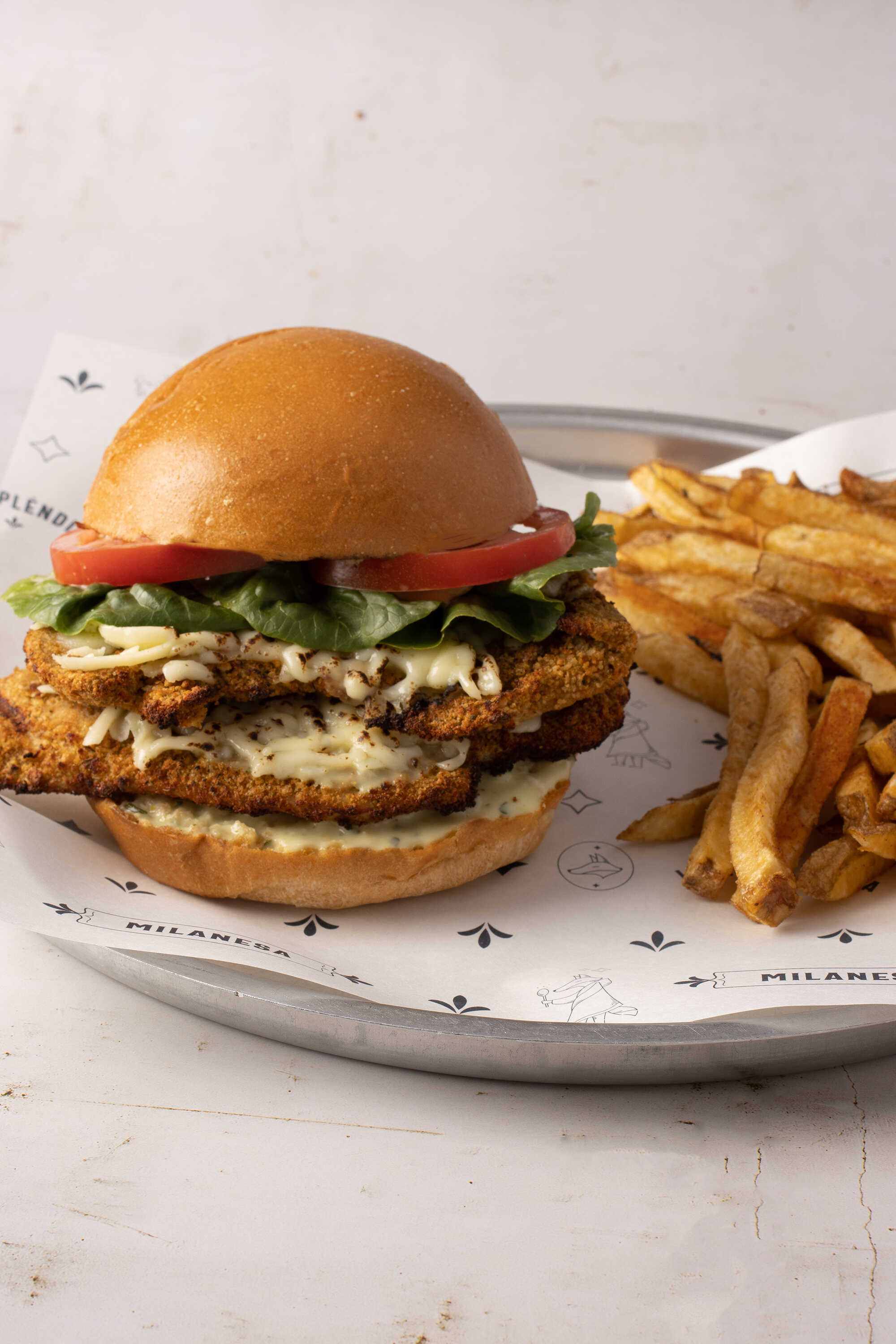 Sándwich de milanesa al horno con proteína a tu elección, queso mozarella, mix verdes de temporada, tomates uvalina, salsa de la casa y 200g de papa francesa.