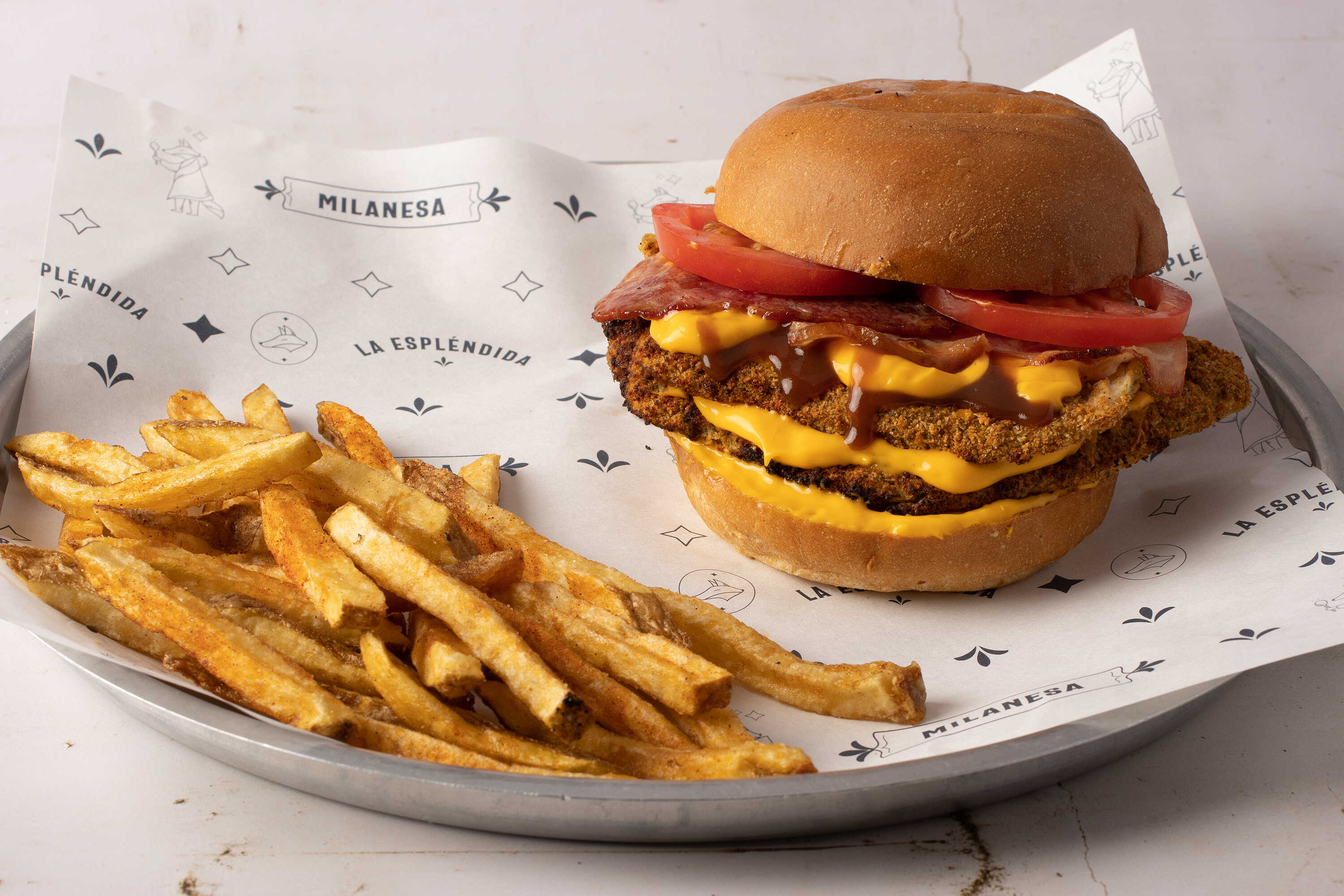 Sándwich con milanesa de cerdo, salsa bbq, tocineta, queso cheddar y mix de verdes y 200g de papa francesa.