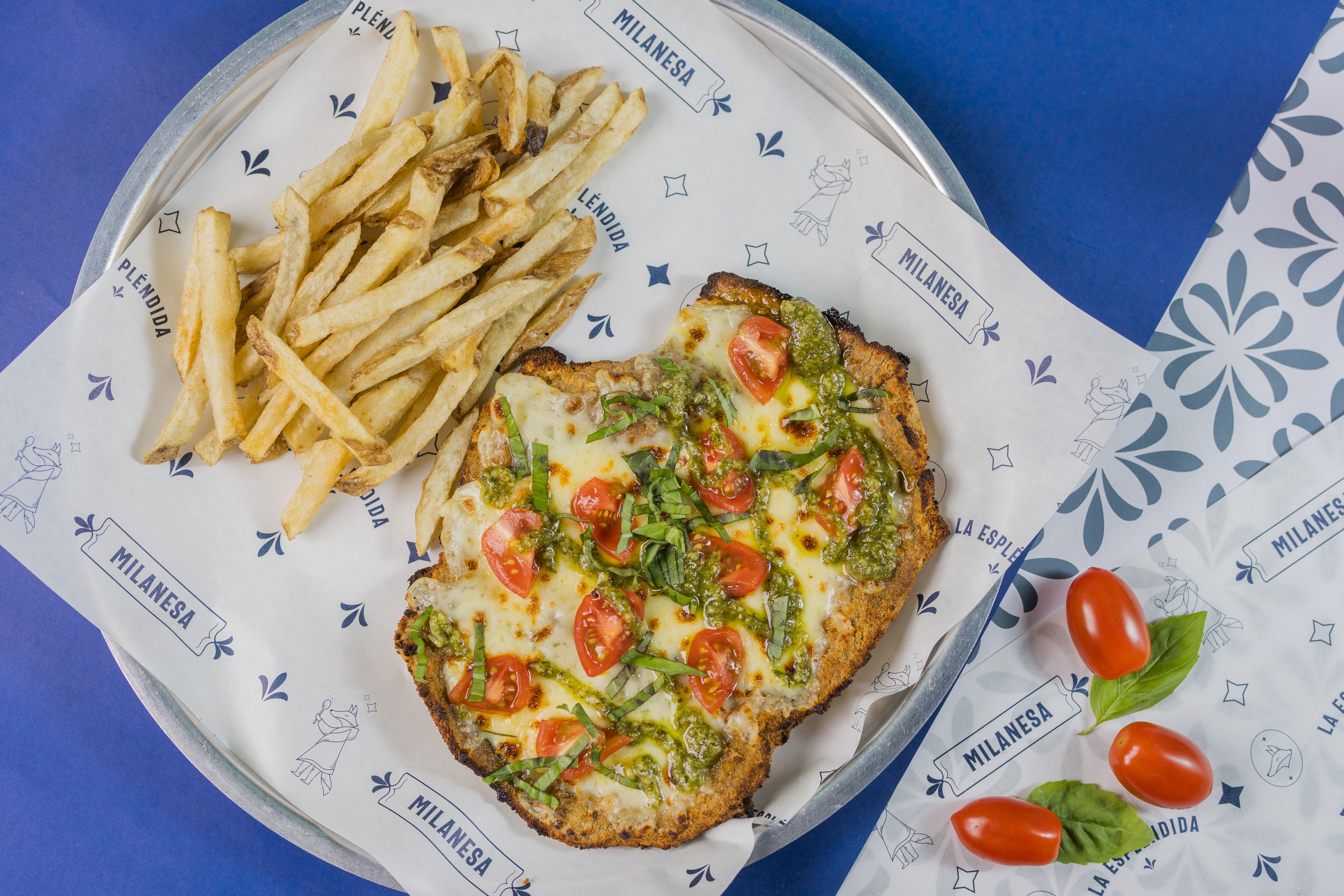 Milanesa al horno con proteína a tu elección, queso mozarella, pesto, tomates uvalina y hojas de albahaca acompañado de 200g de papa francesa.