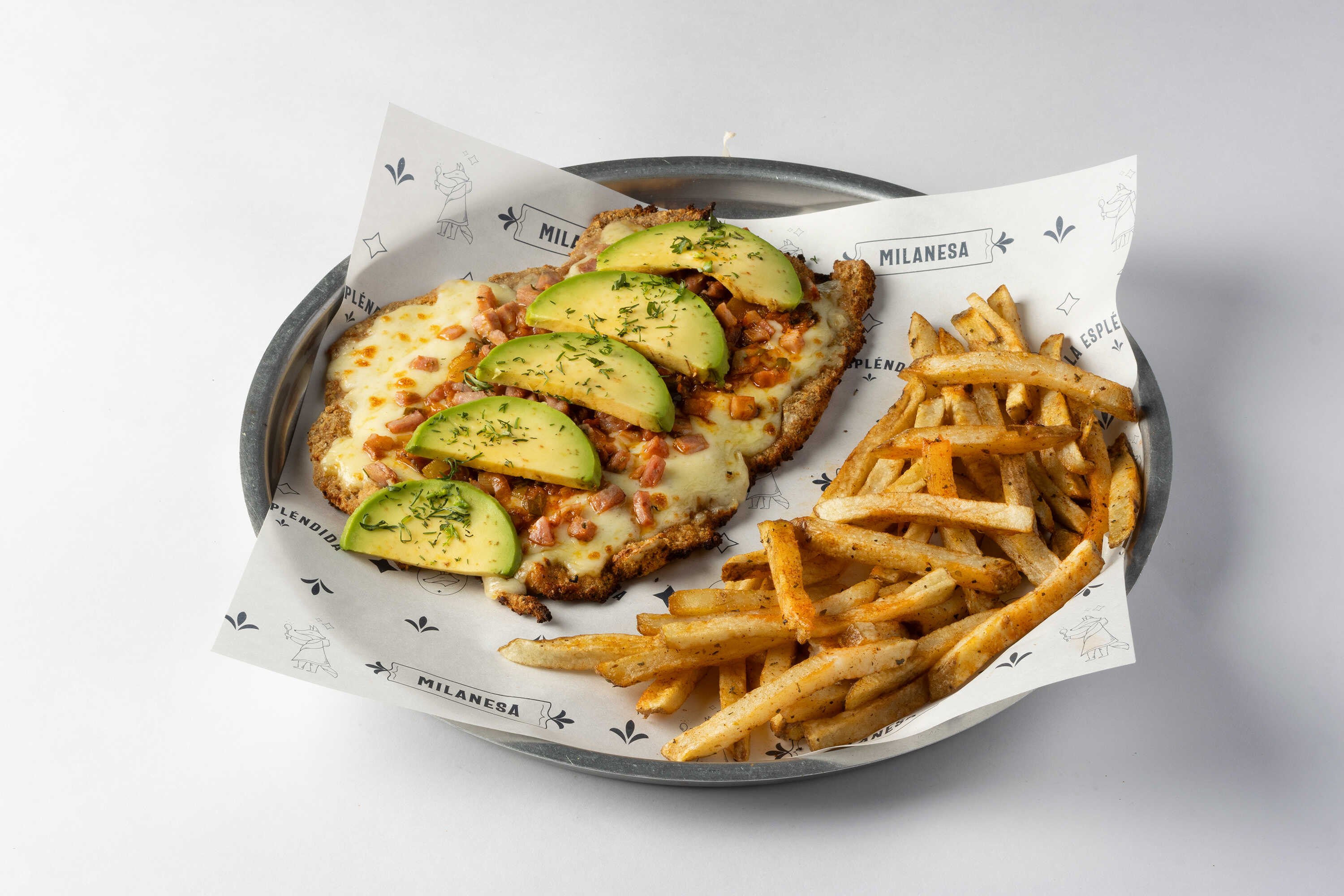 Plato personal con proteina (Milanesa) a elección de 160g, 80g de queso mozarella, hogao, chorizo picado y aguacate acompañado con 200g de papa francesa.