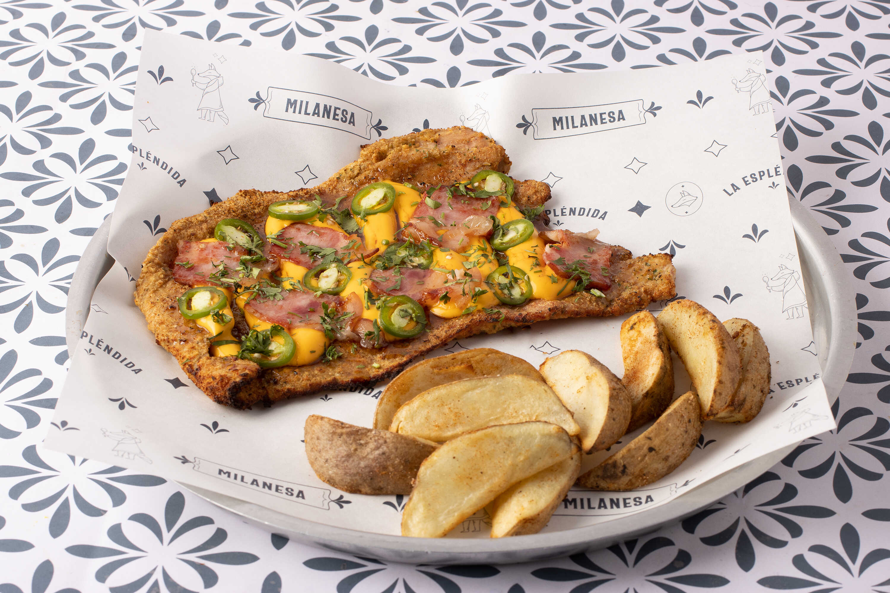 Milanesa al horno con proteína a tu elección, queso cheddar, tocineta, jalapeños frescos, miel y cilantro acompañado con 200g de papa francesa. .