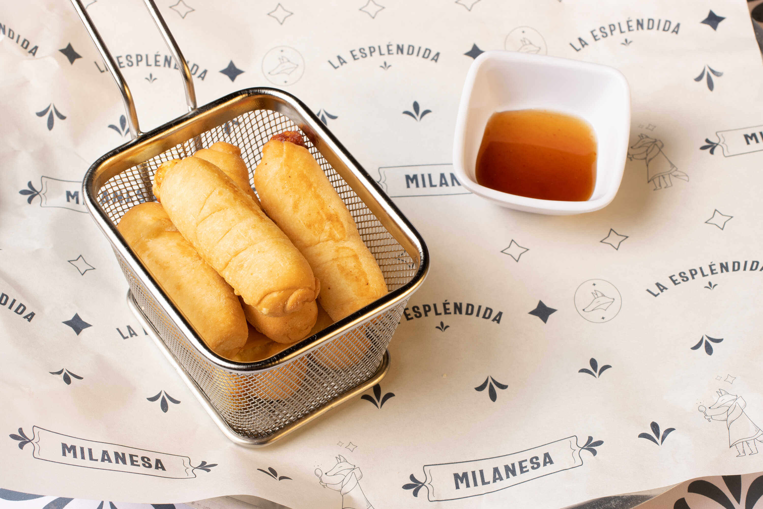 Deliciosos tequeños rellenos de queso semiduro acompañado con salsa de la casa.