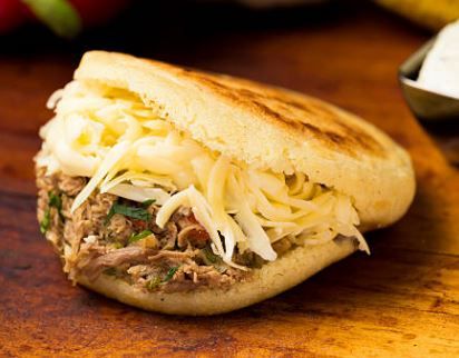 Arepa con carne desmechada y queso.