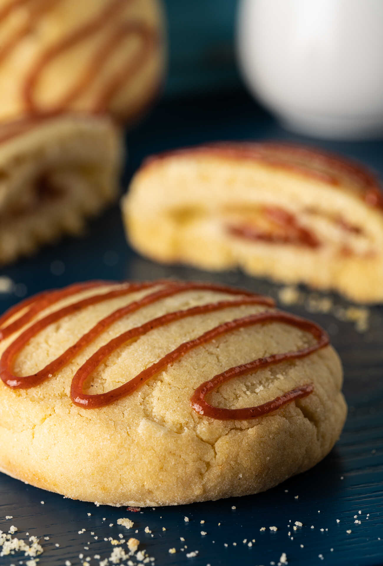Rellena de arequipe decorada con mermelada de frutos rojos y oblea triturada.