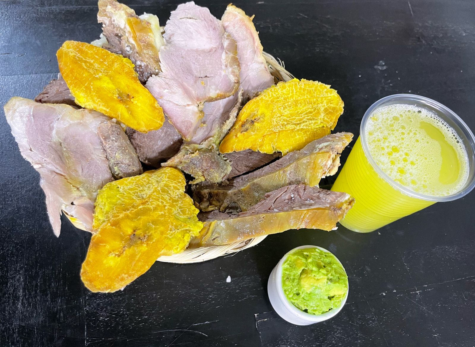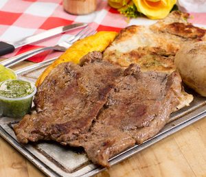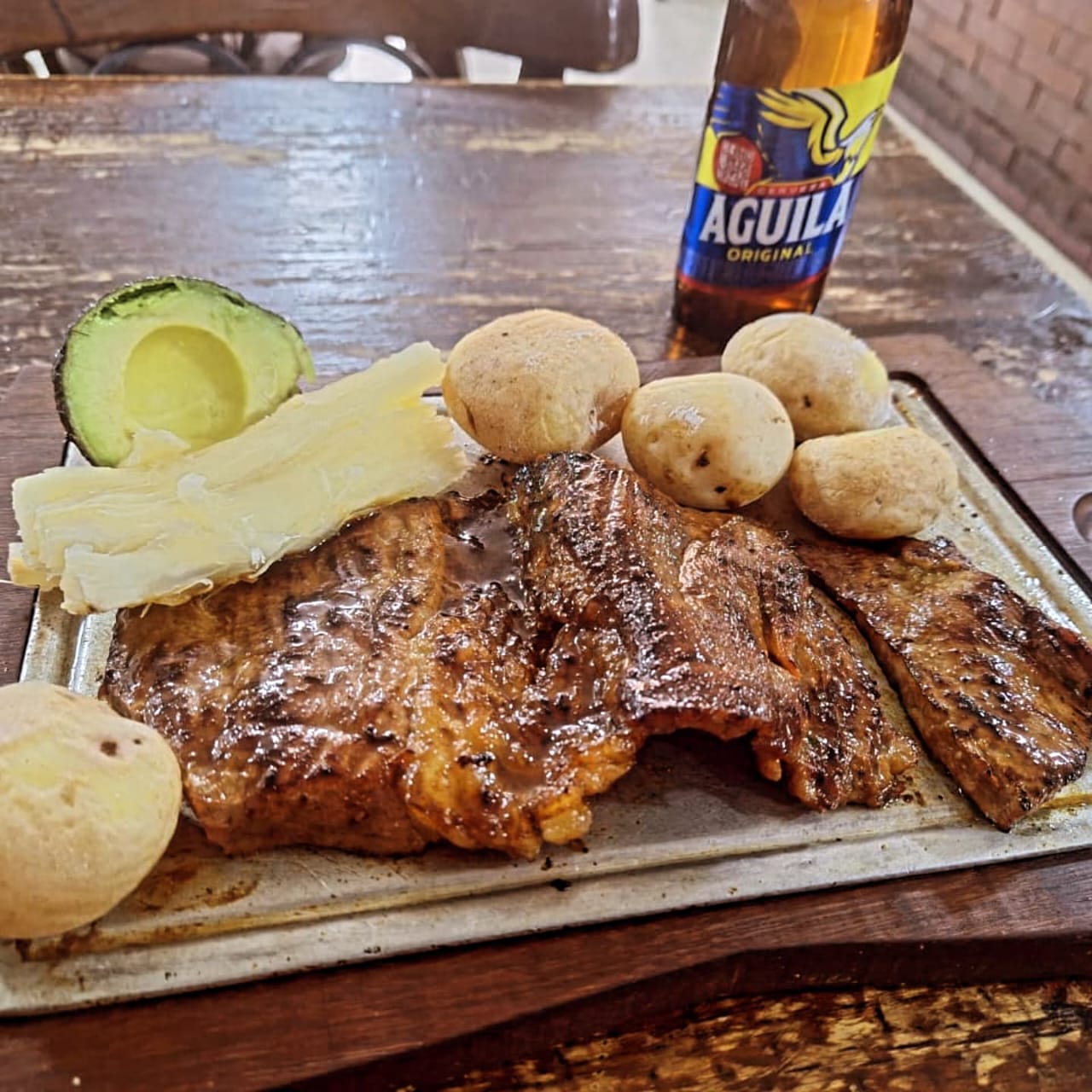 Plato generoso de carne a la llanera, chigüiro, guacamole, papa y yuca con bebida de la casa.
