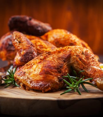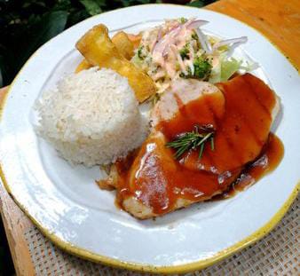 Pechuga BBQ (130 g) y sopa del día de 16 oz, viene acompañada de 1 porción de papa a la francesa (35 a 40 g), arroz, yuca y ensalada del día.