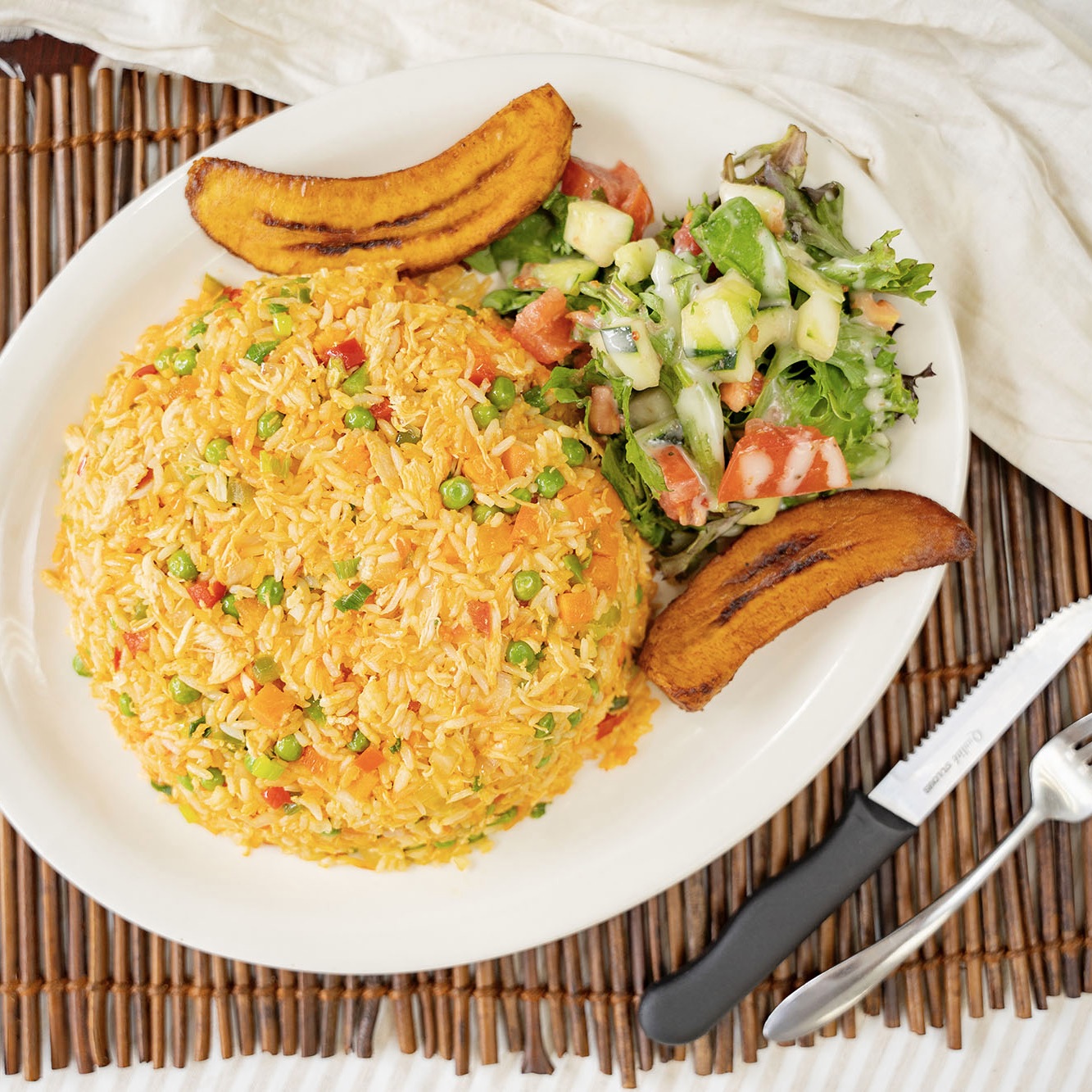 Arroz con carne llanera de res picada en tiras, pollo picado en tiras, cerdo picado en tiras, chigüiro picado en tiras, salchicha SM, acompañado de papa a la francesa, ensalada y bebida de la casa.