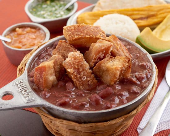 Frijol, chicharrón, complementada con arroz aguacate y la bebida.