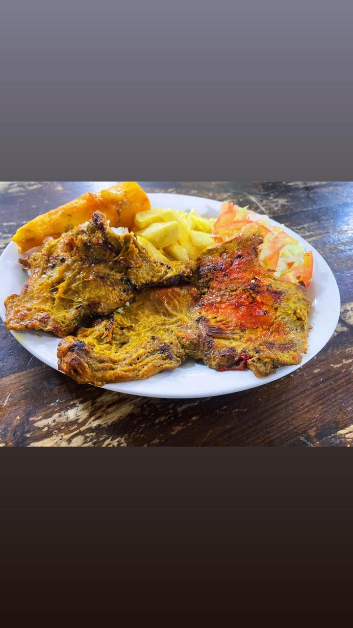 Exquisito churrasco acompañada de papas francesa, arroz, yuca y ensalada