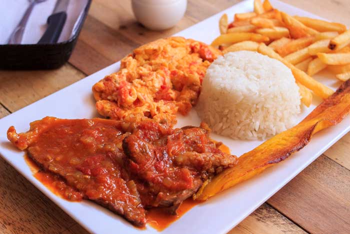 Carne en bistec, arroz, huevos al gusto, papa frita, tajada de maduro y bebida del día sujeto a disponibilidad de la tienda puedes recibir (chocolate, limonada natural y jugo natural)