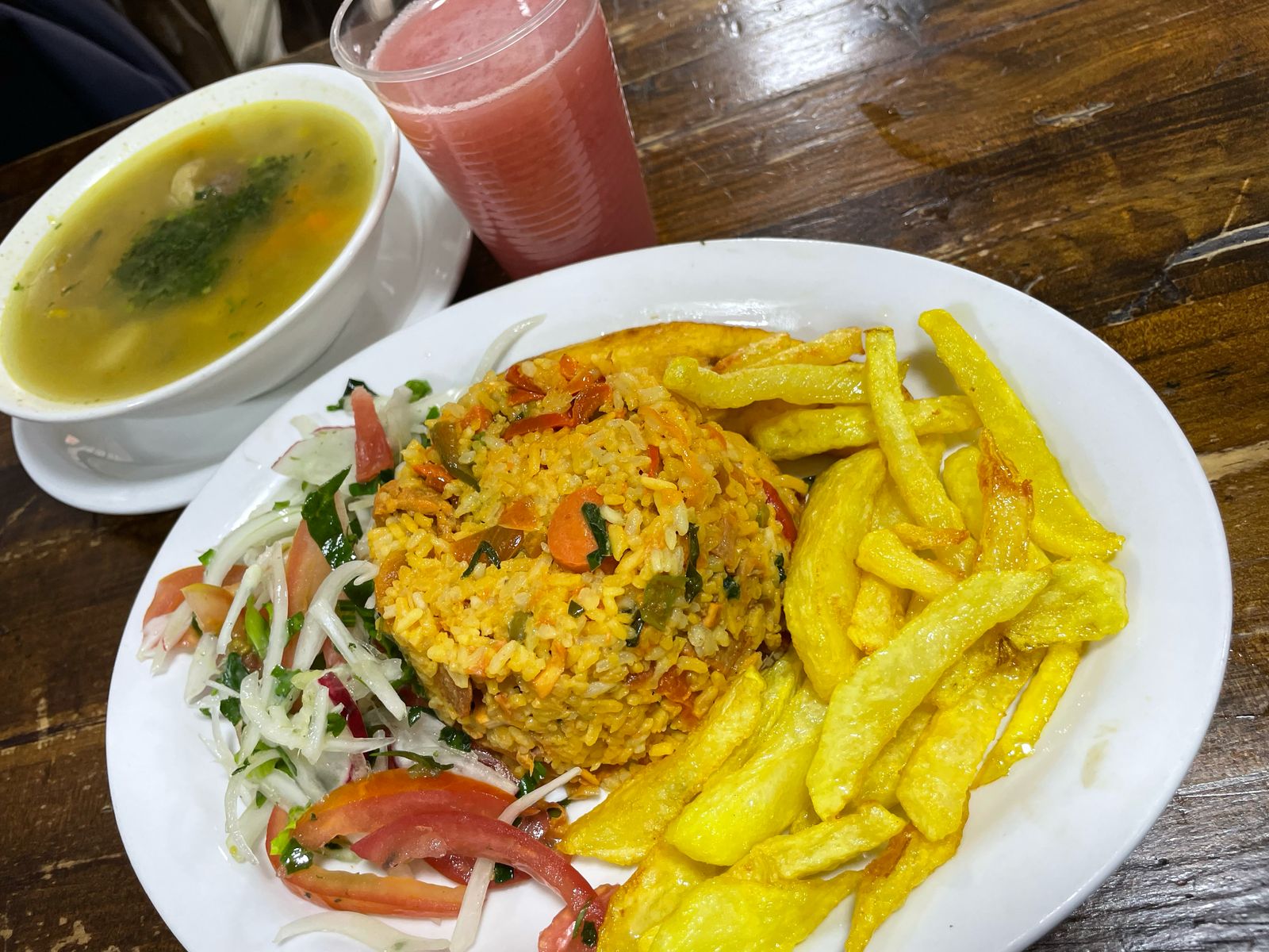 Sopa, acompañada de papa a la francesa, arroz, yuca y ensalada.