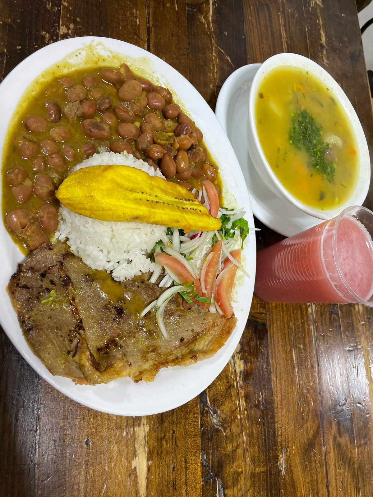 Proteína de elección (res, cerdo o pechuga) acompañado de arroz, ensalada, principio frijol, tajadas de maduro, puedes elegir entre (sopa y fruta) y bebida de la casa.