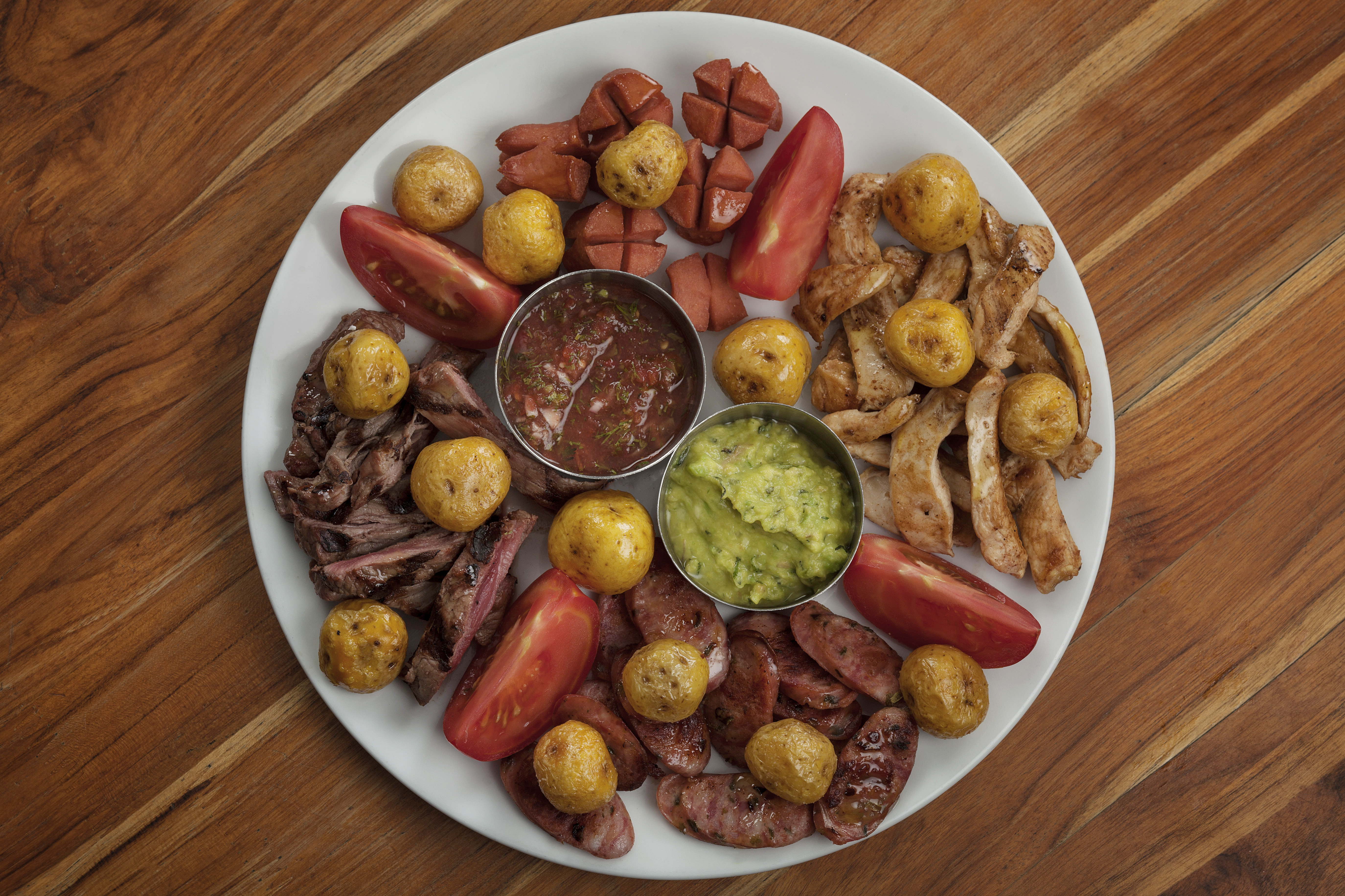 Picada de lomo de res, pollo, chorizo, salchicha, papa criolla, tomate, guacamole y ají criollo.