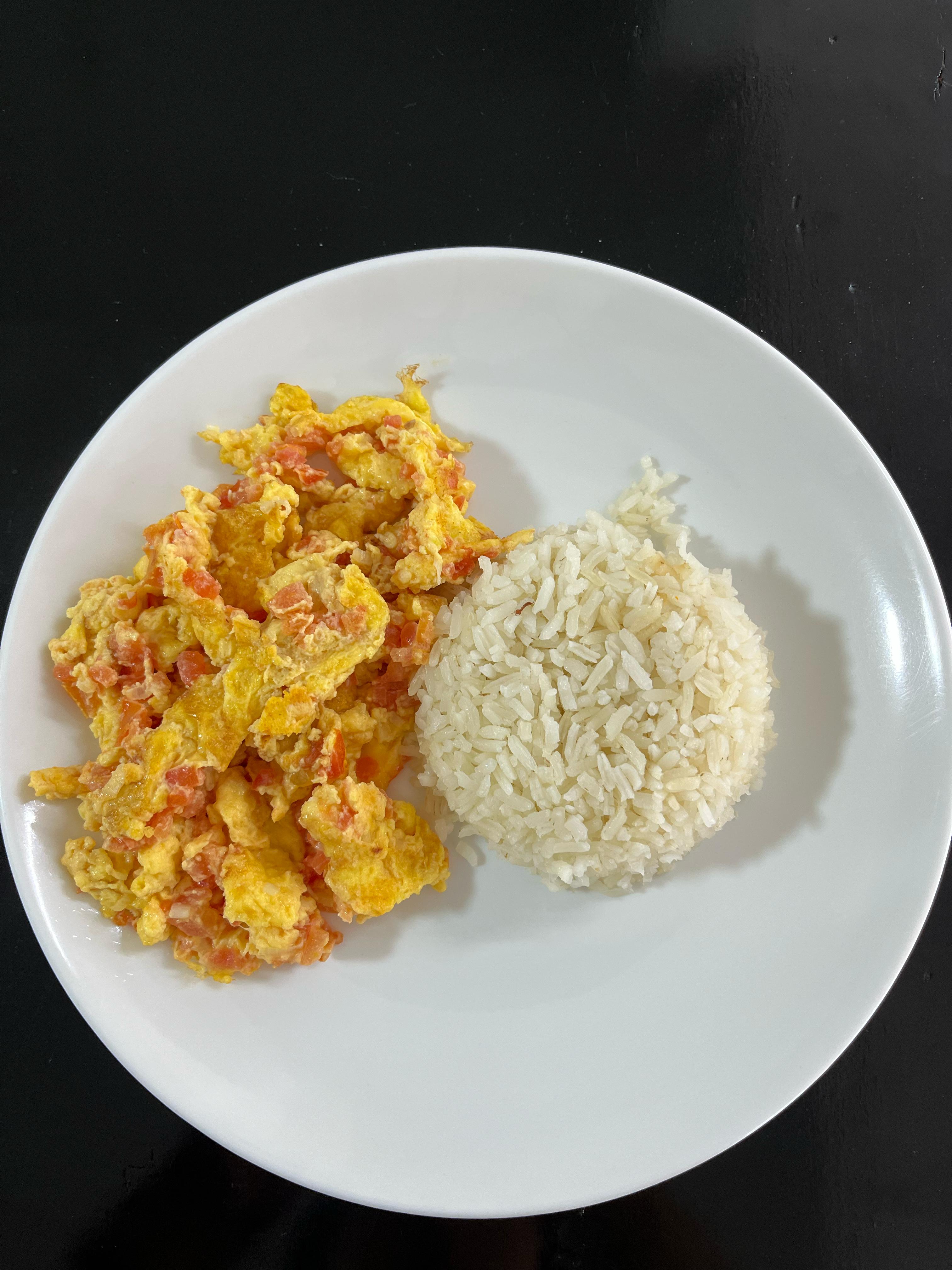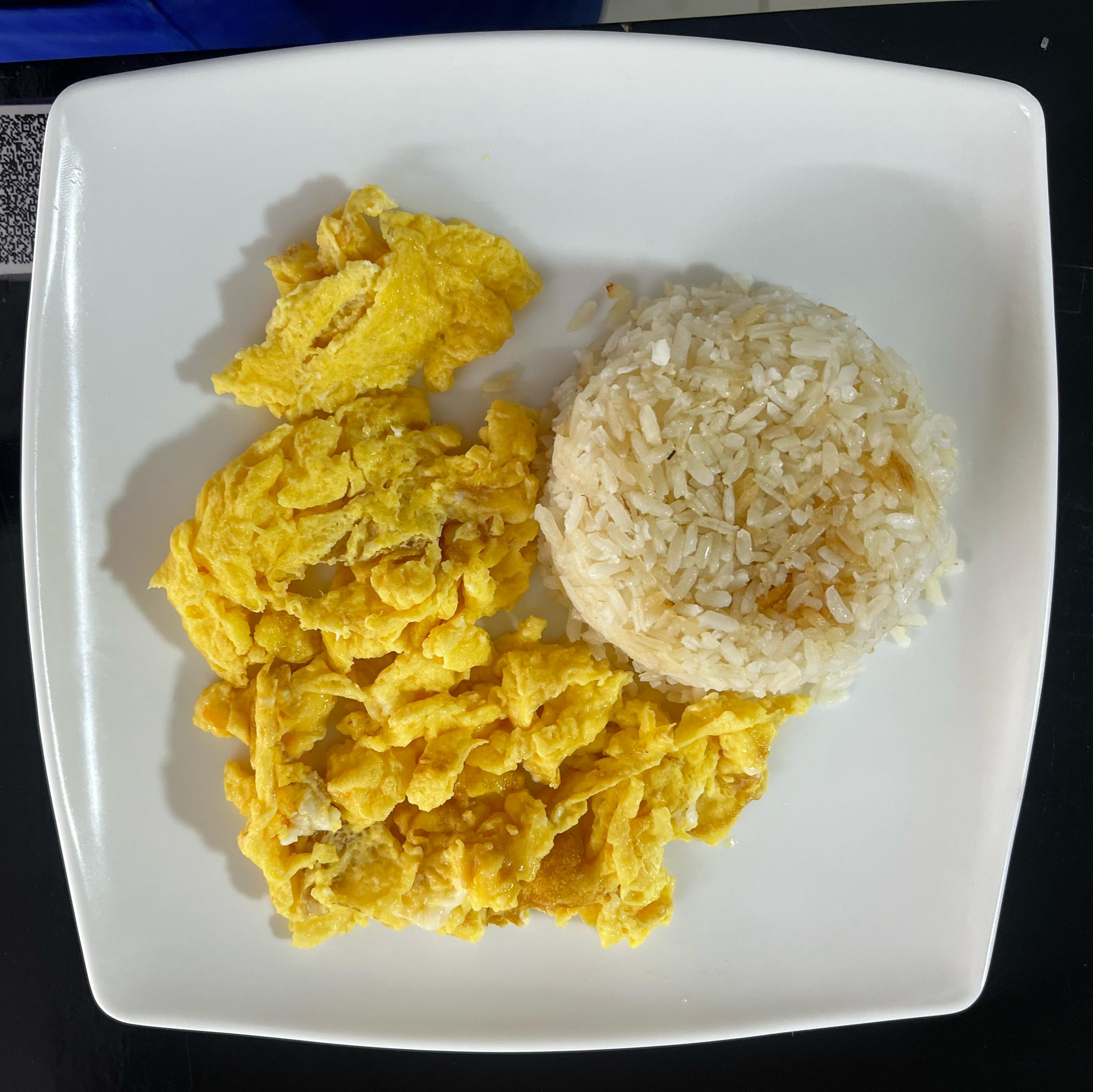 Huevos con arroz + caldo de costilla + chocolate o gaseosa personal 250 ml y pan.