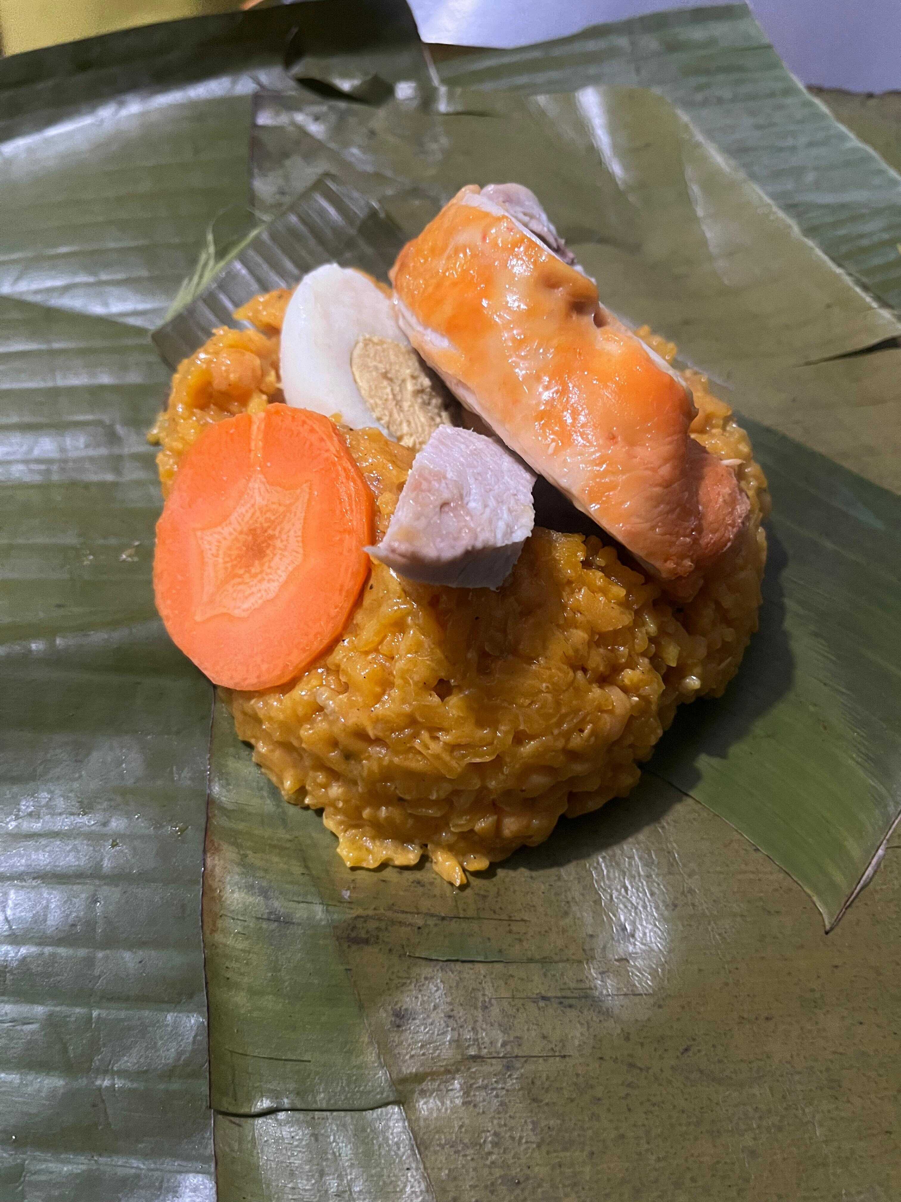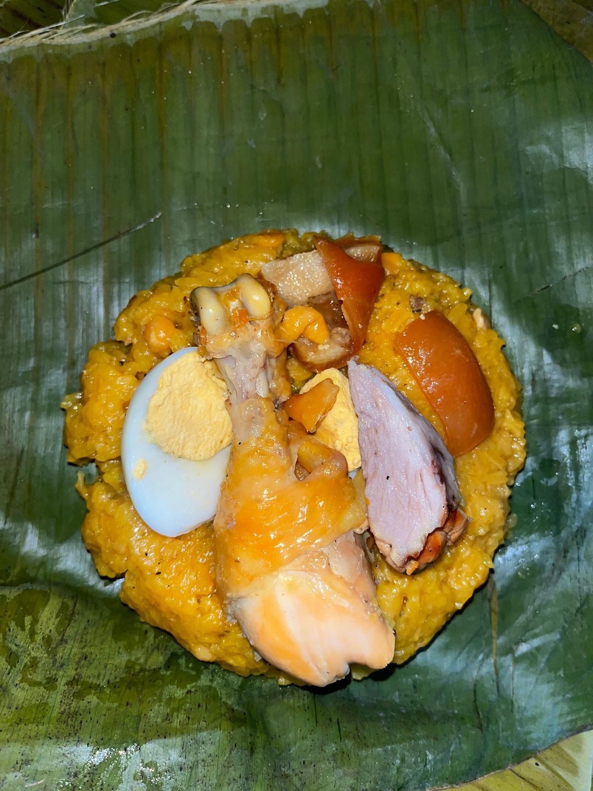 Tamal a base de arroz, porción de gallina criolla 80 g, carne de cerdo 15 g, huevo, tocino, zanahoria y arepa.