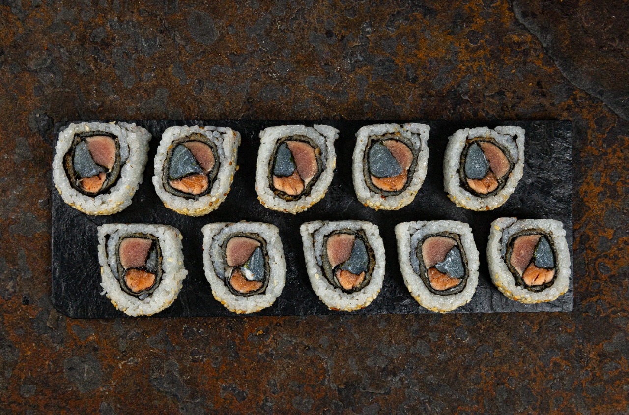 Atún, salmón y aguacate envuelto en masago, acompañado con tártara oriental, tamaño a elegir .