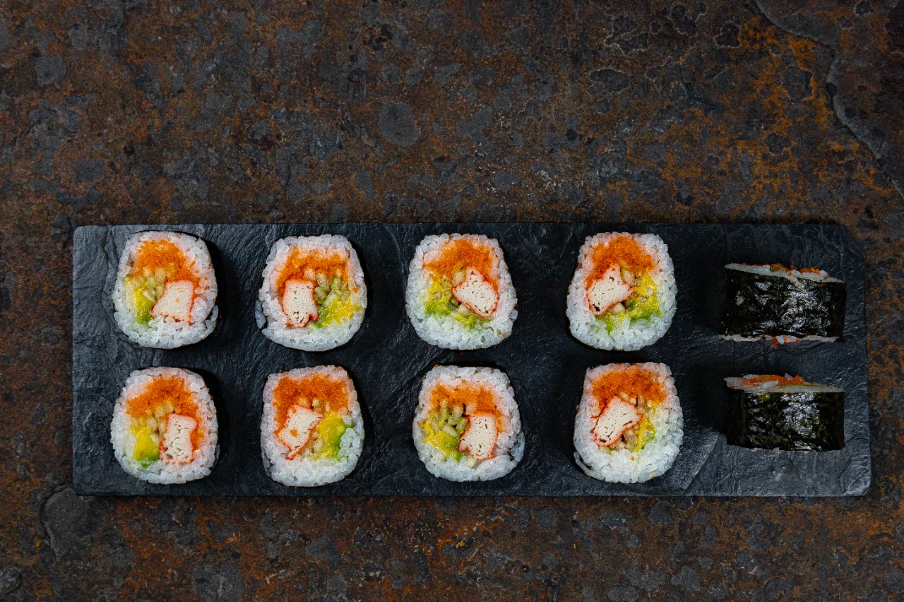 La mejor combinación posible palmito de cangrejo, pepino europeo, aguacate y masago, tamaño a elegir.