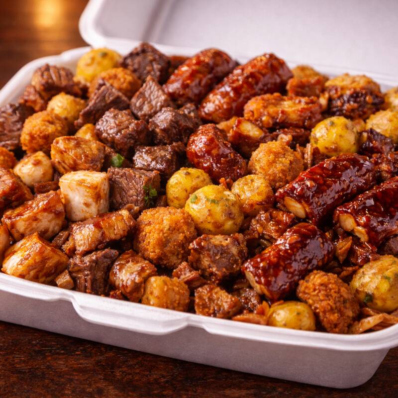 filete de pechuga, carne de res, cerdo, chorizo, costillitas BBQ , nuggets y Papa criolla