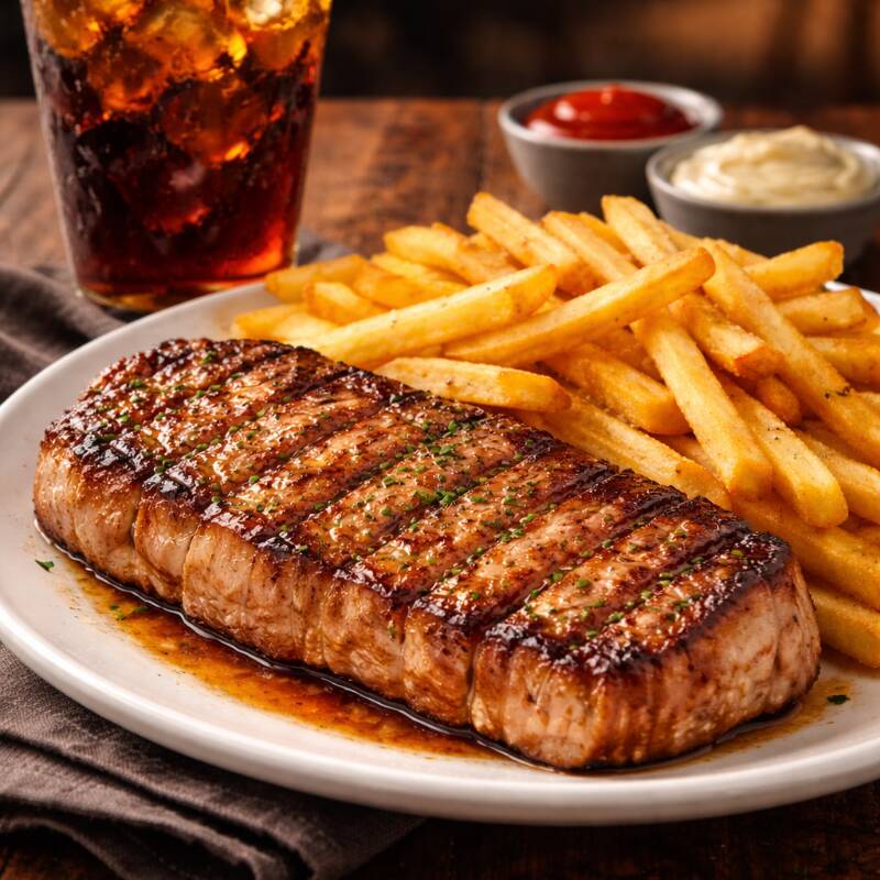 Lomo de cerdo jugoso a la parrilla de 300g y. Papa a la francesa y gaseosa