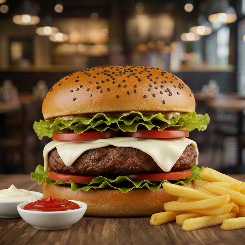 Deliciosa hamburguesa acompañada queso doble crema, cebolla caramelizada papas chips lechuga y tomate