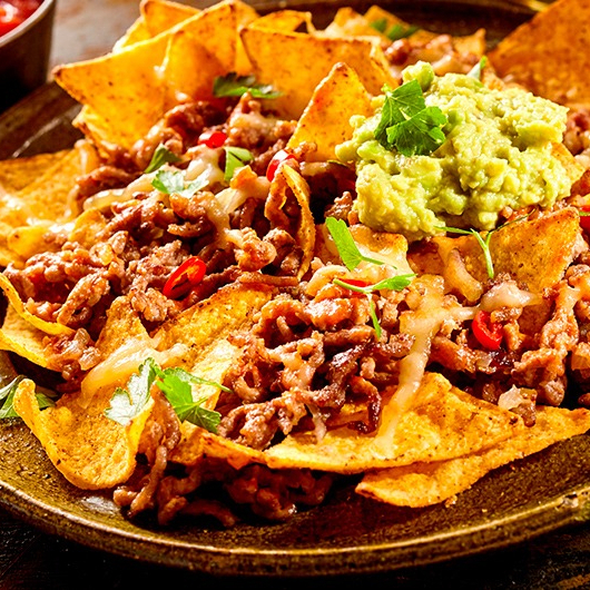 Doritos acompañado de lechuga en salsa tártara, con carne molida sazonada en pimienta y orégano, pico de gallo mexicano maíz jamón y tocineta