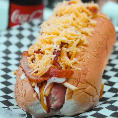 Pan artesanal salchicha queso cheddar, jamón, tocineta, papas chips y salsas