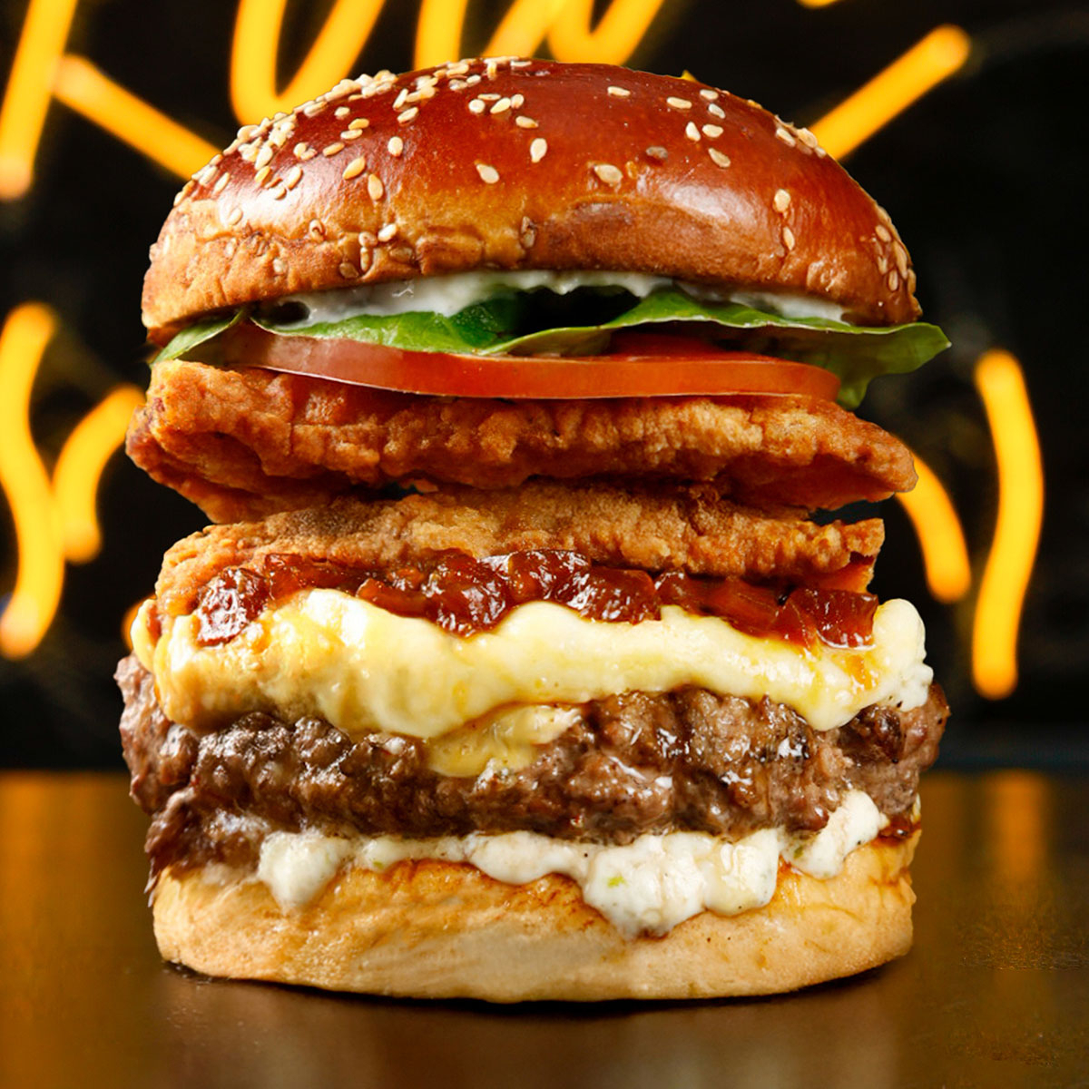 Deliciosa hamburguesa acompañada queso cheddar, chorizo, tocineta, jamón, huevo, cebolla caramelizada, papas chips, aguacate, lechuga y tomate