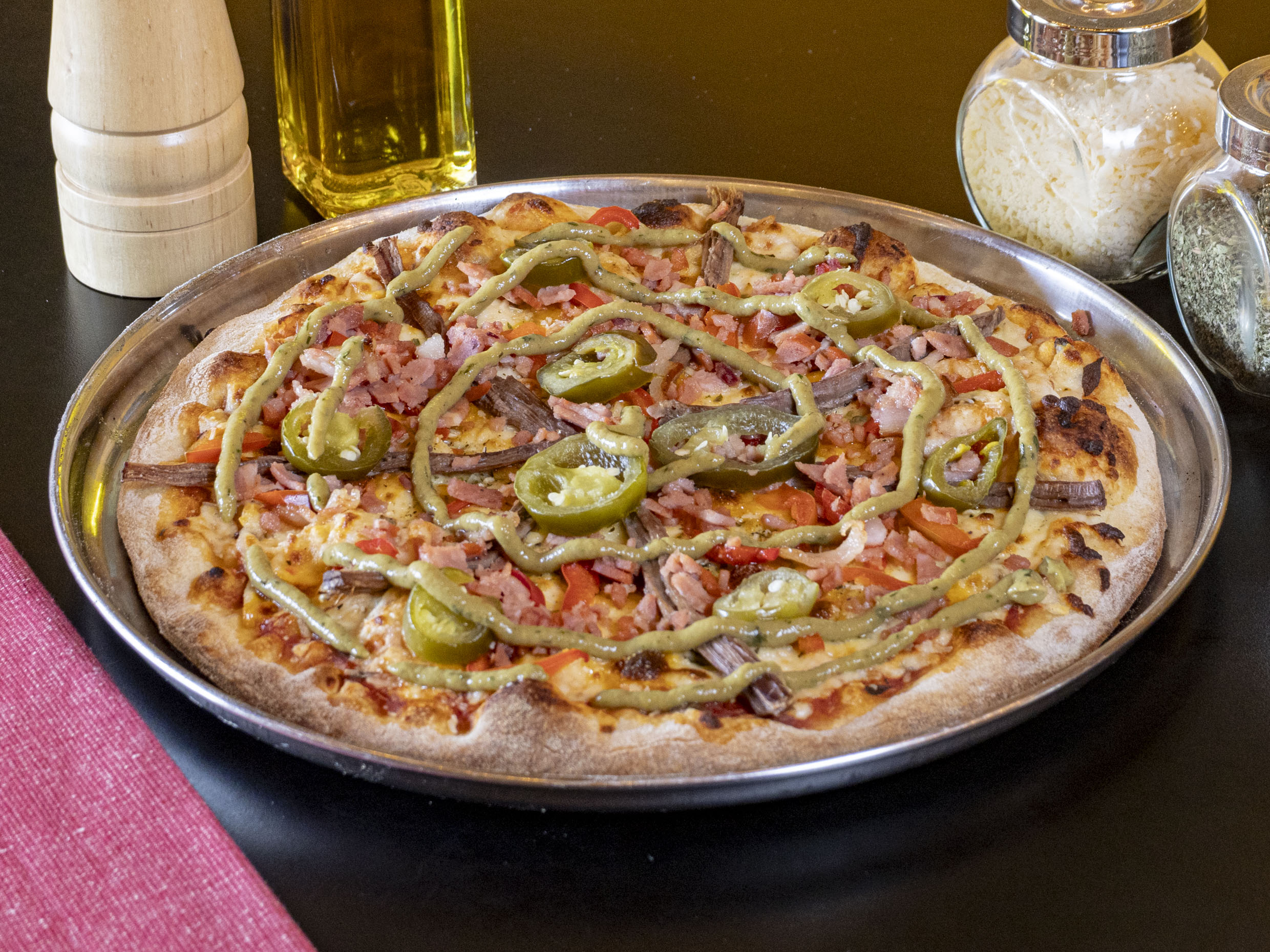 Salsa napolitana, queso, carne desmechada, tocineta, pimentón, jalapeños y aguacate.