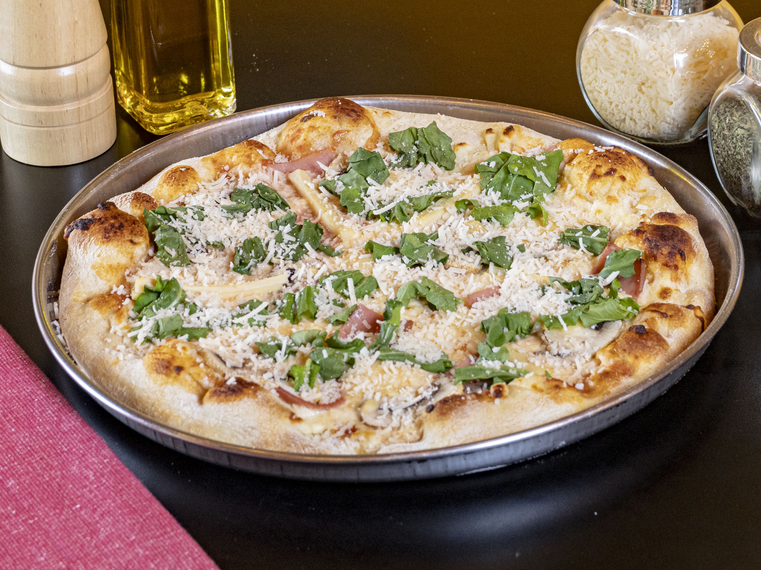 Salsa napolitana, champiñones, aceitunas, espárragos, rúgula, queso gratinado, zucchini, y queso parmesano.