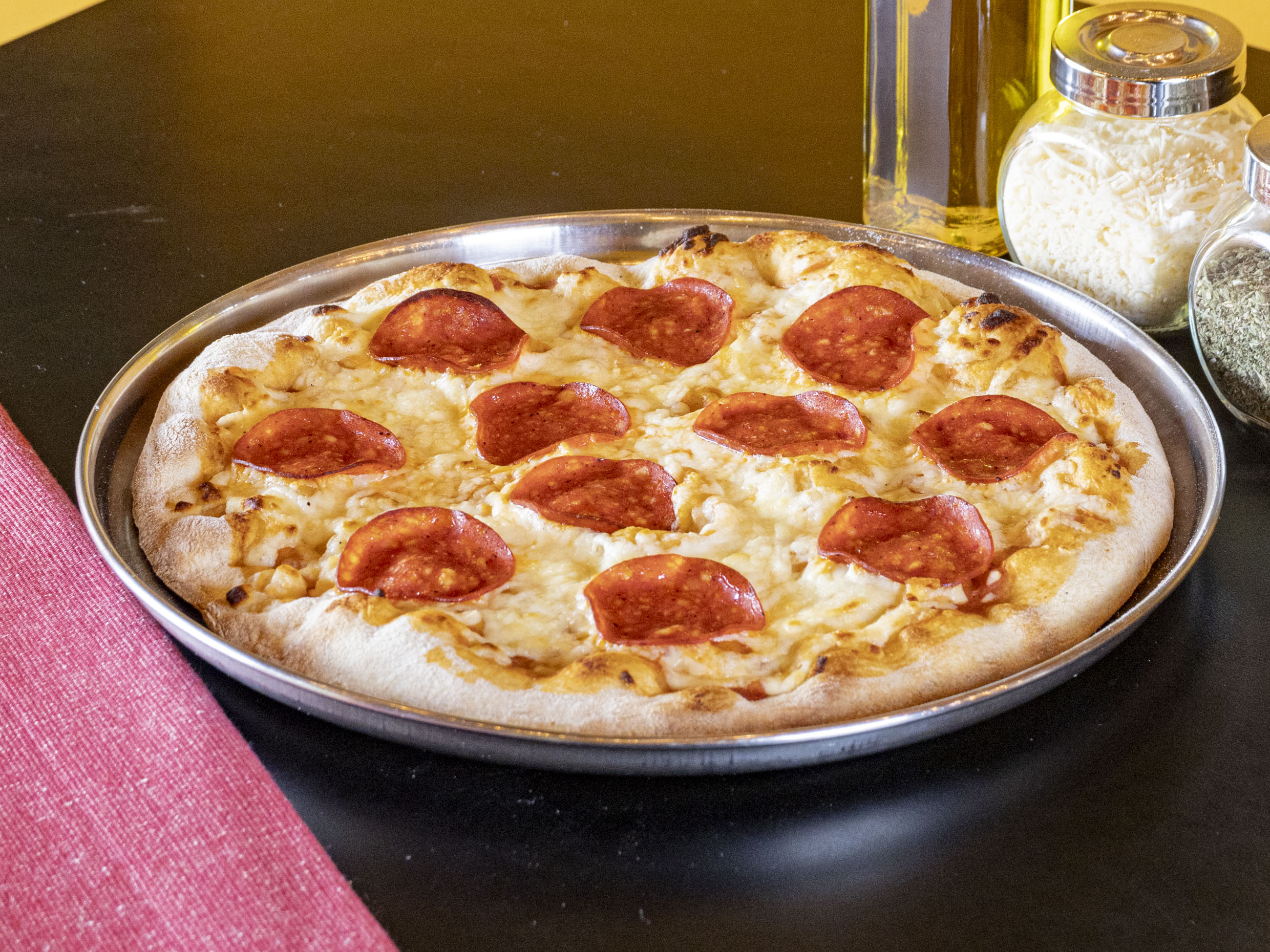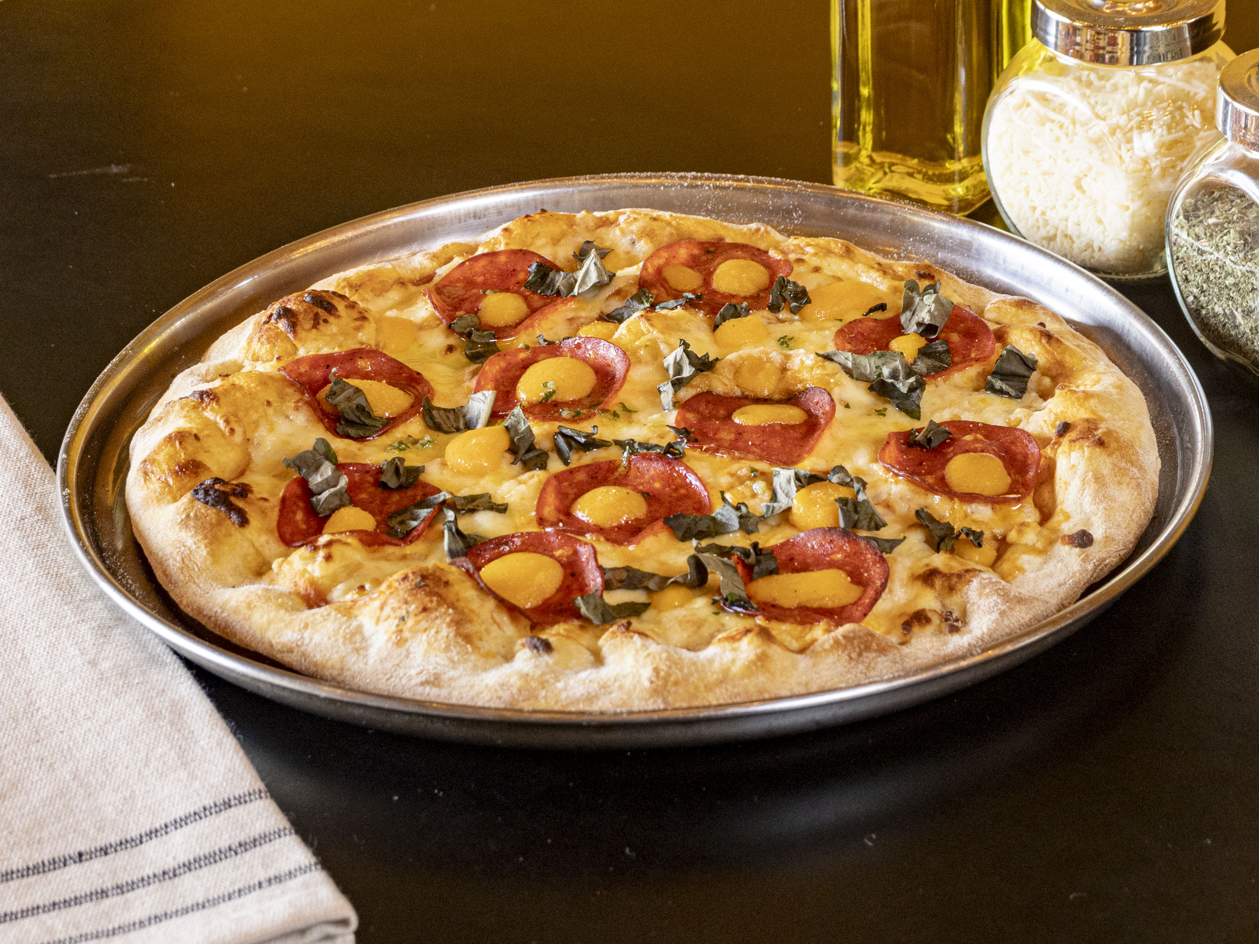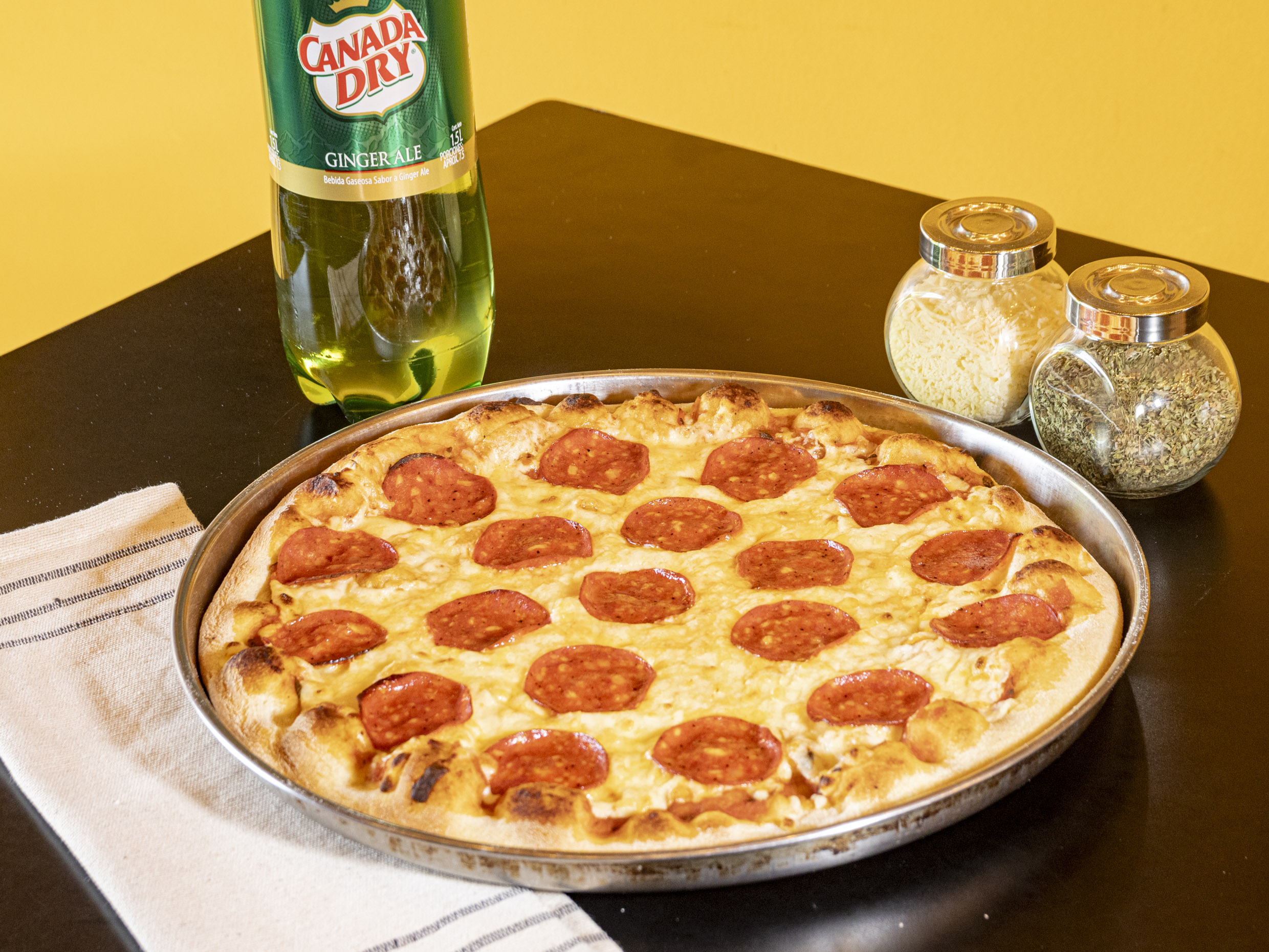 Salsa napolitana, queso, pepperoni americano, queso holandés, albahaca y salsa de ajo en aceite de oliva.