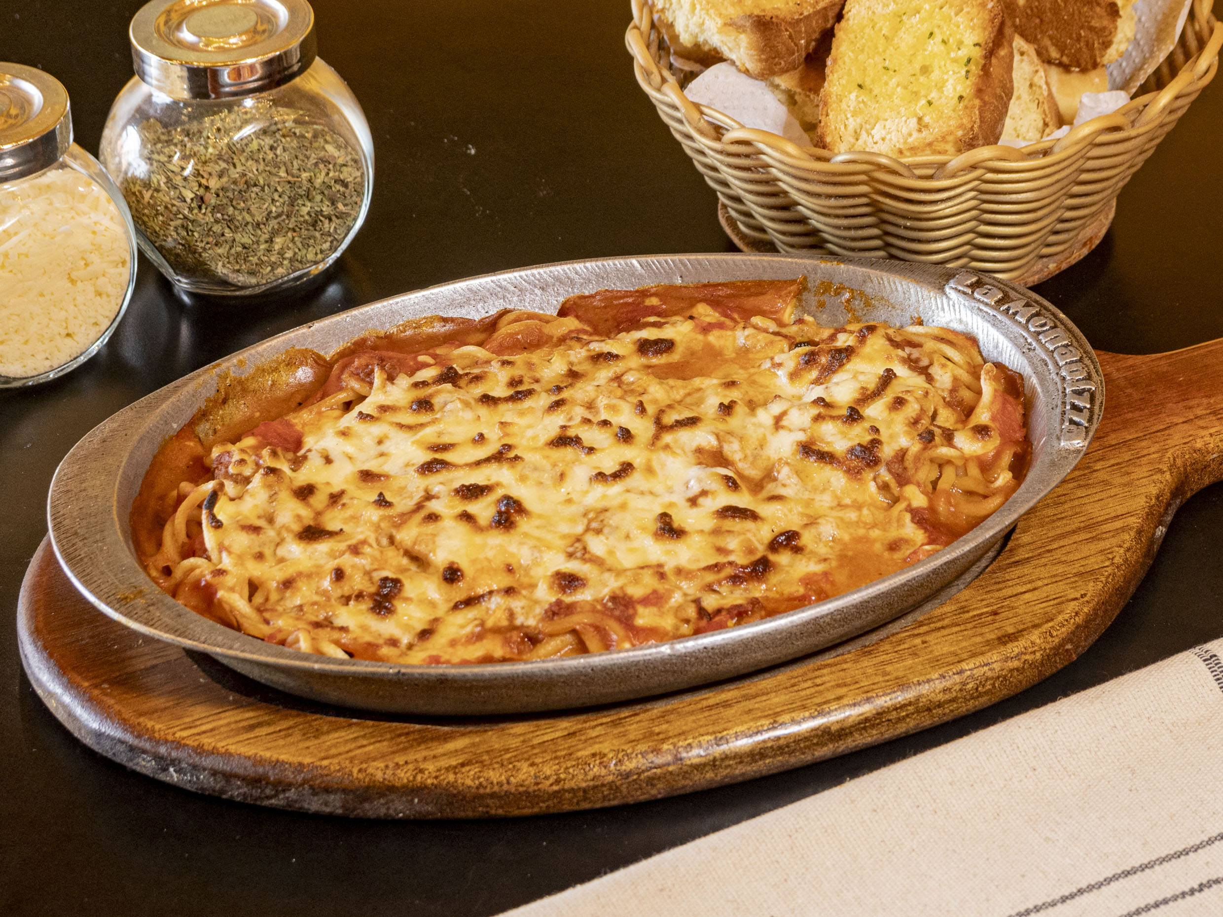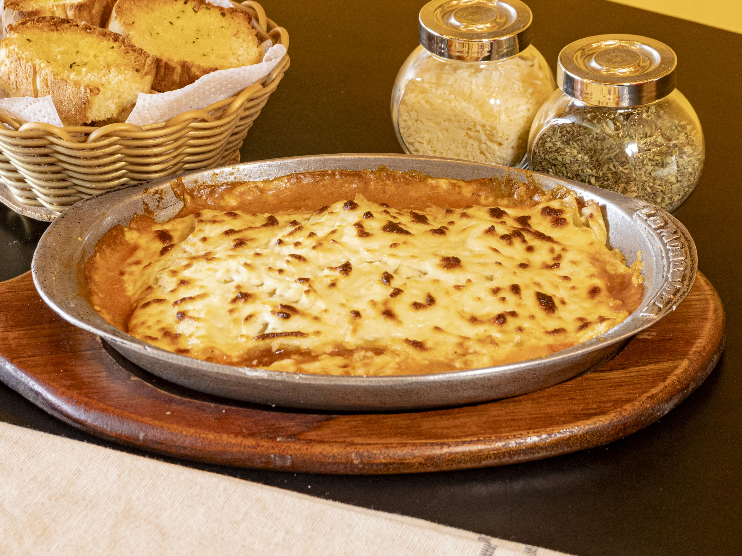 Salsa boloñesa, pollo, champiñones y queso gratinado.