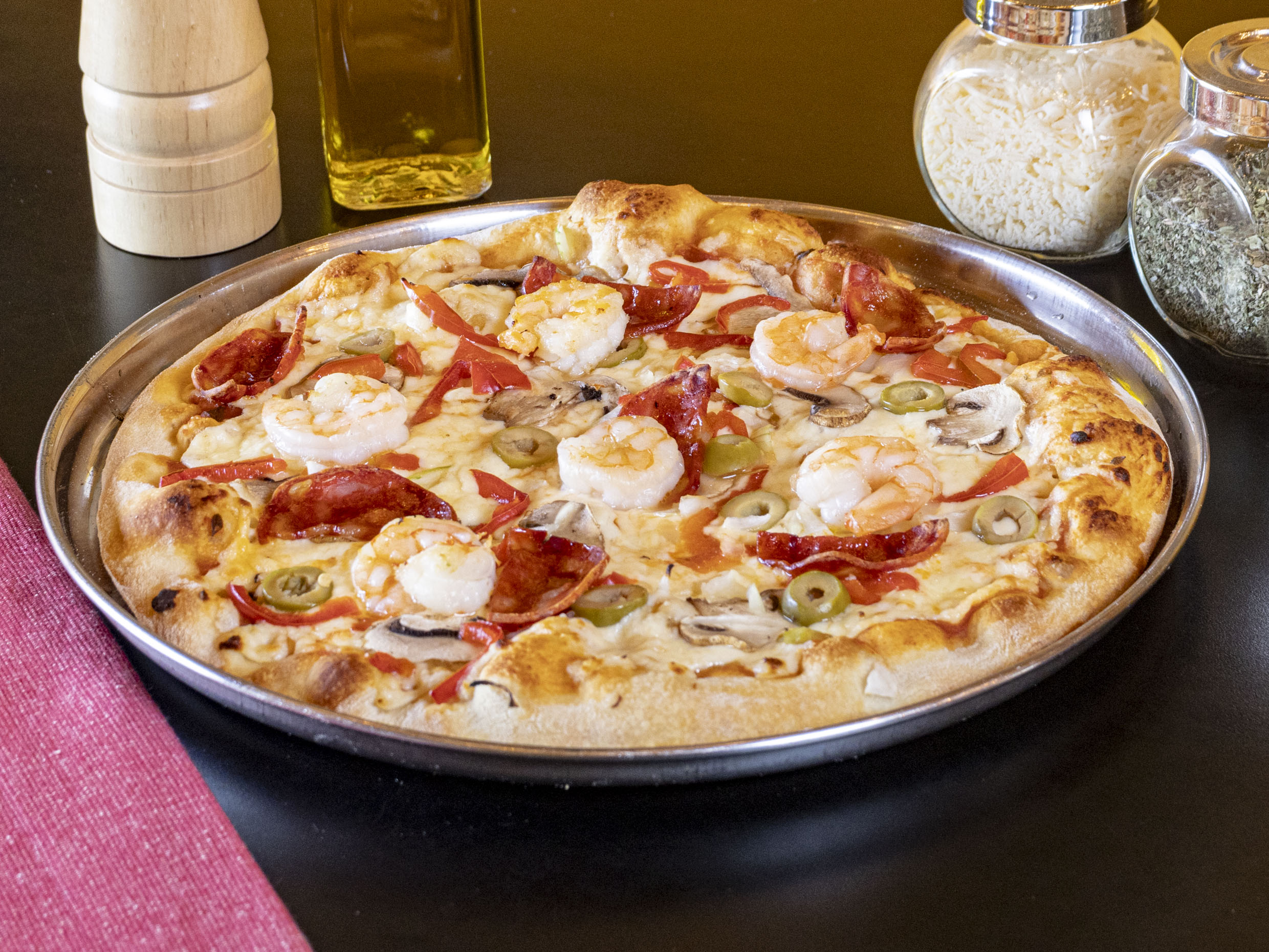 Salsa napolitana, queso, champiñón, pollo, cebolla, pimentón, salami, camarones y aceitunas.