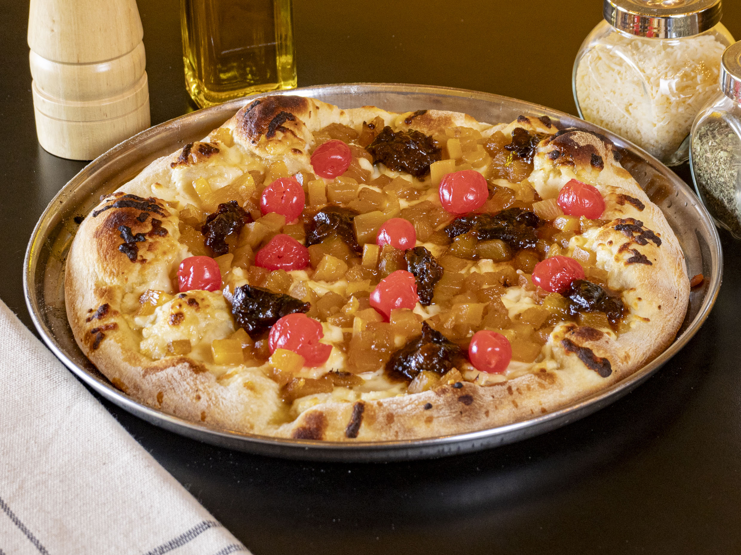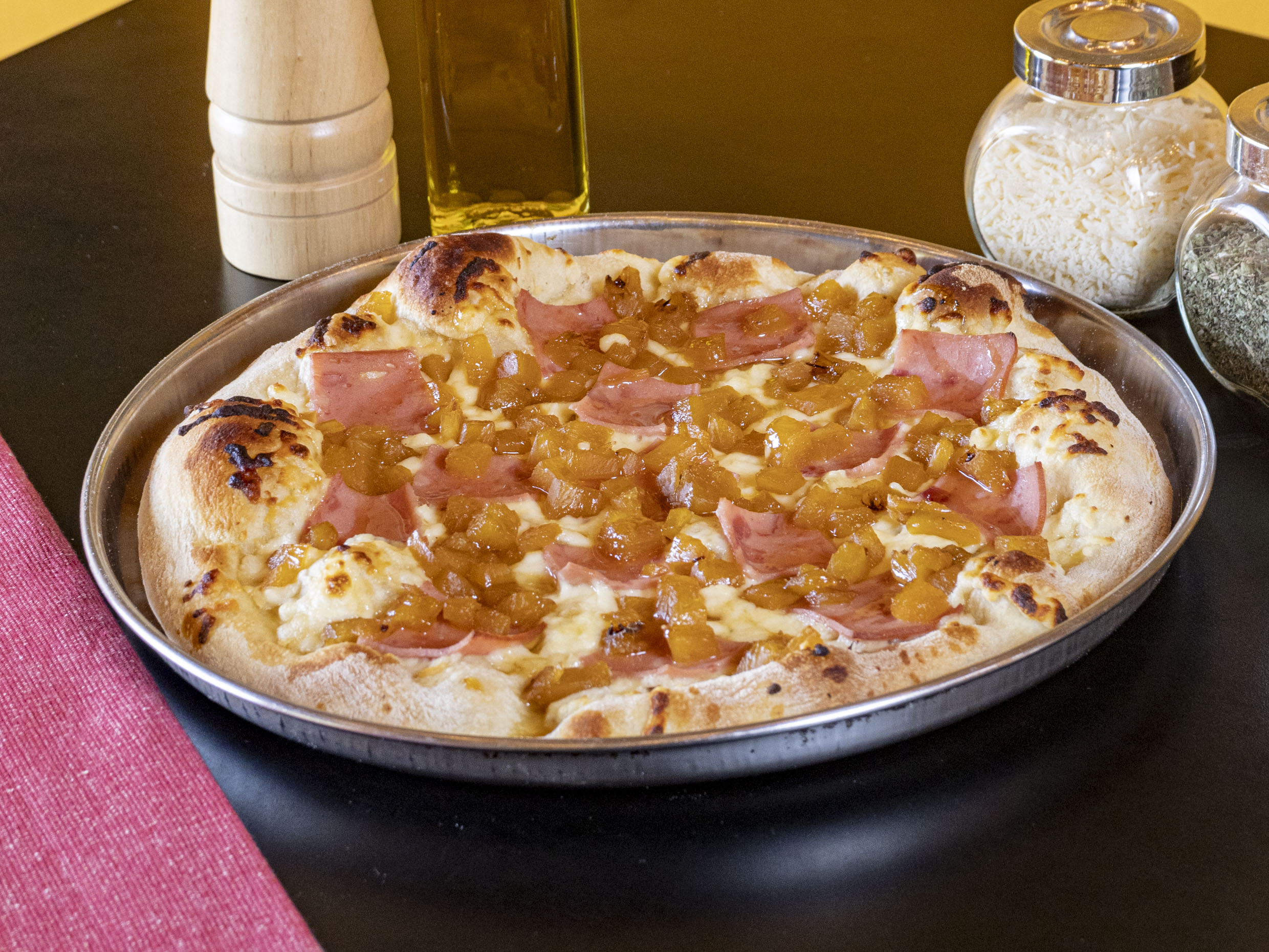 Salsa napolitana, queso, champiñones, cebolla, pimentón y aceitunas.