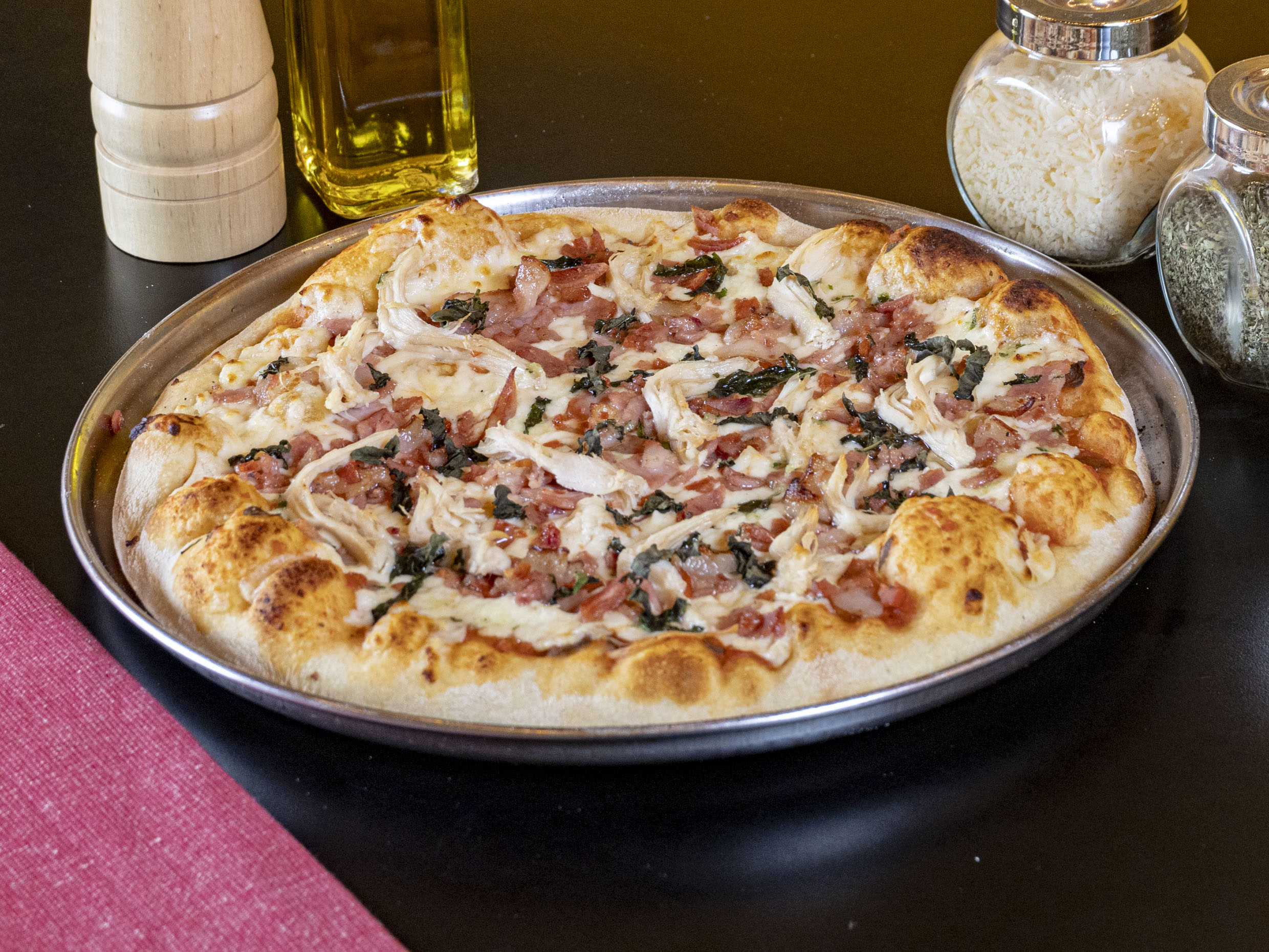 Salsa napolitana, queso, tocineta, pollo, albahaca, salsa de ajo en aceite de oliva.