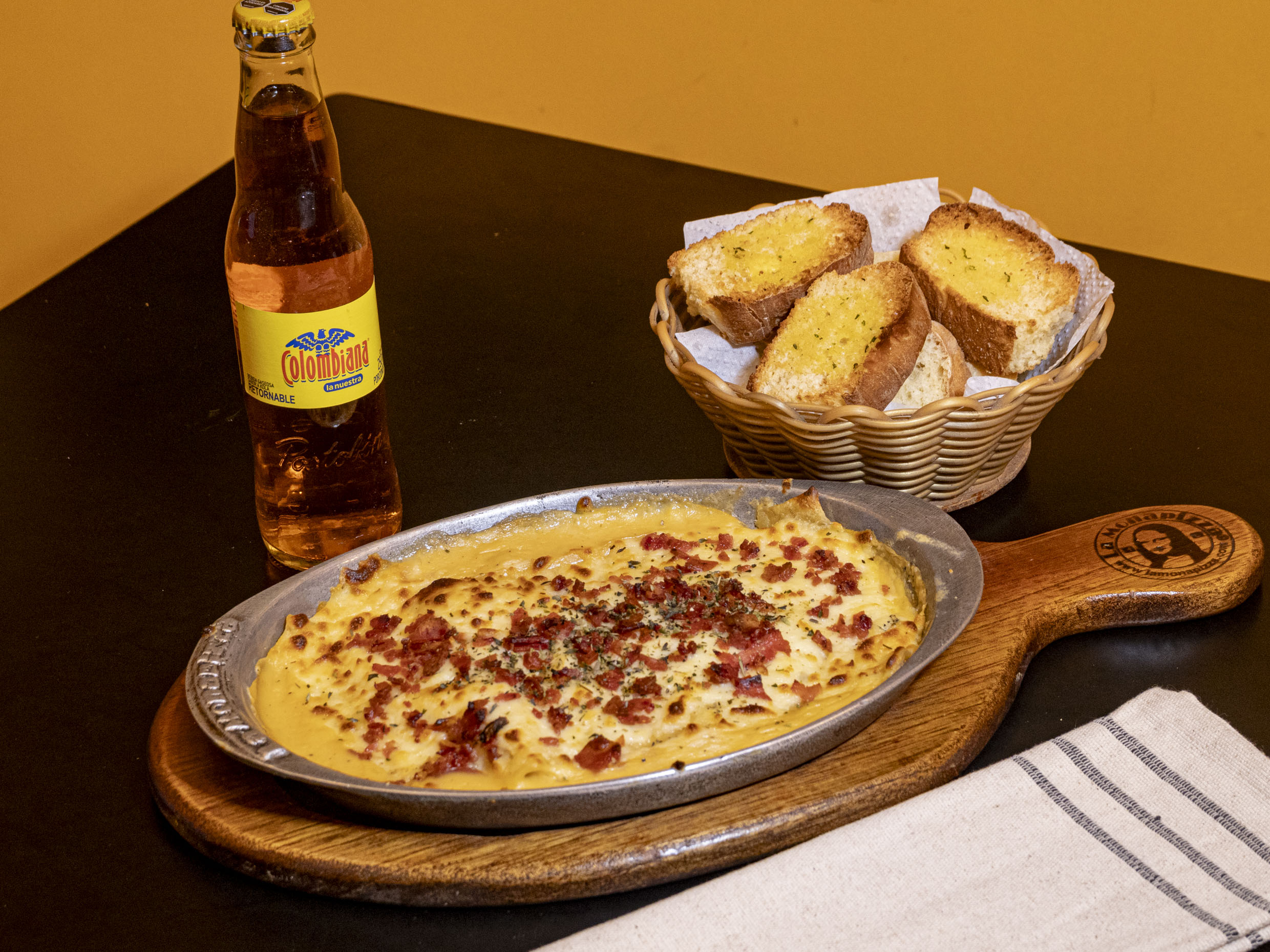 Salsa boloñesa, pollo, tocineta, queso gratinado y salsa bbq.