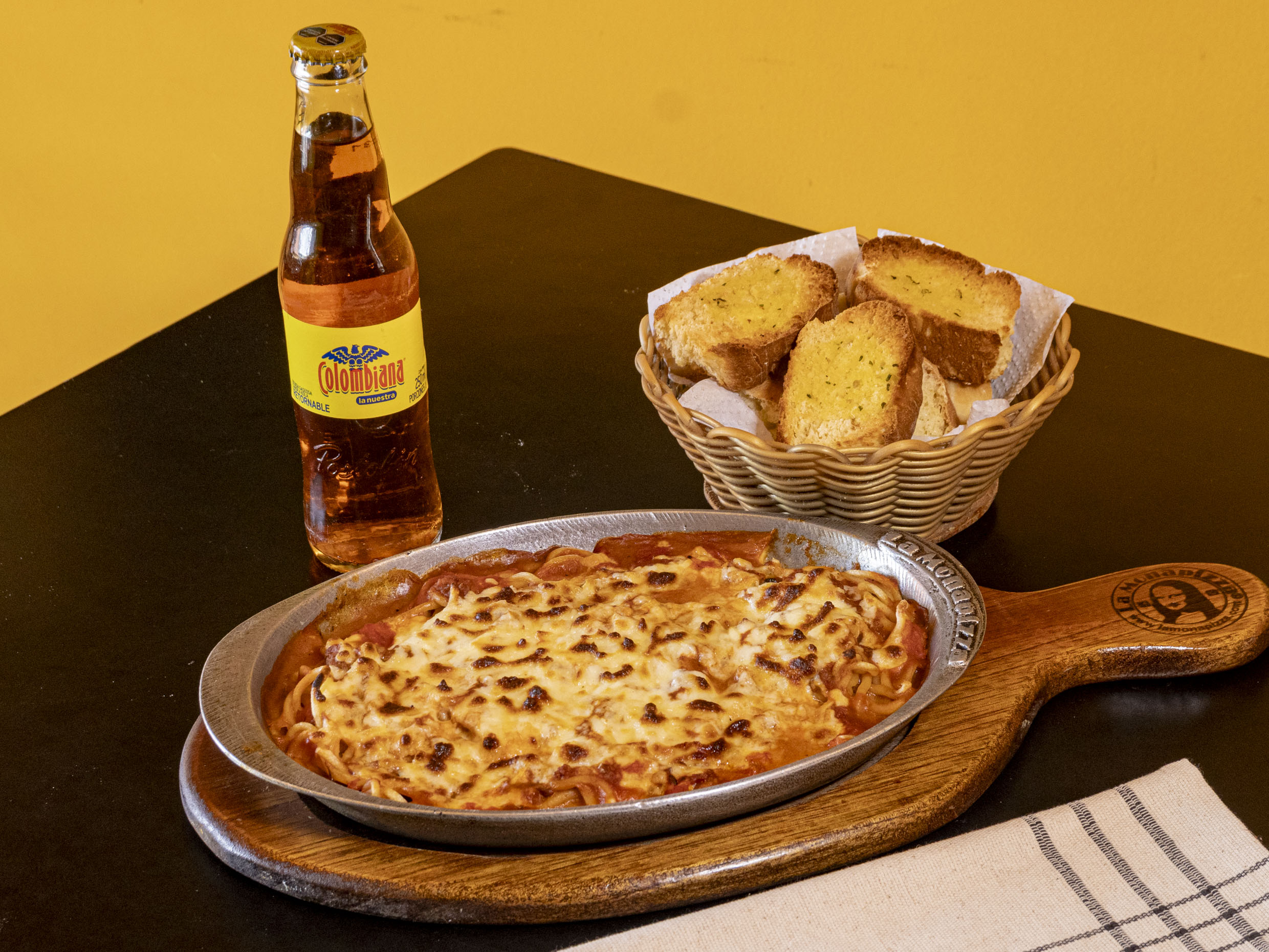 Lasaña o spaguetti en salsa boloñesa con queso gratinado + gaseosa 250ml sabor a eleccion