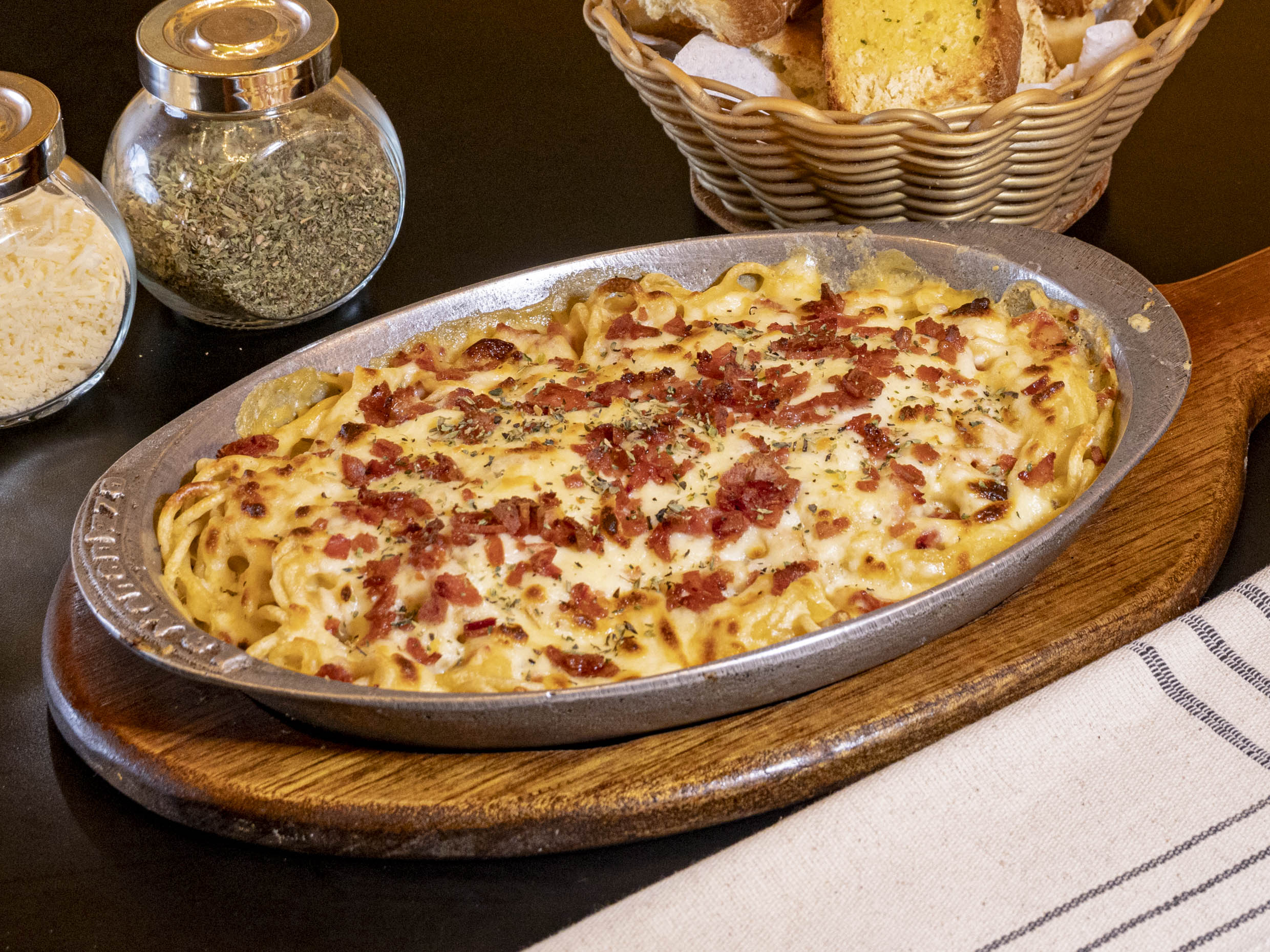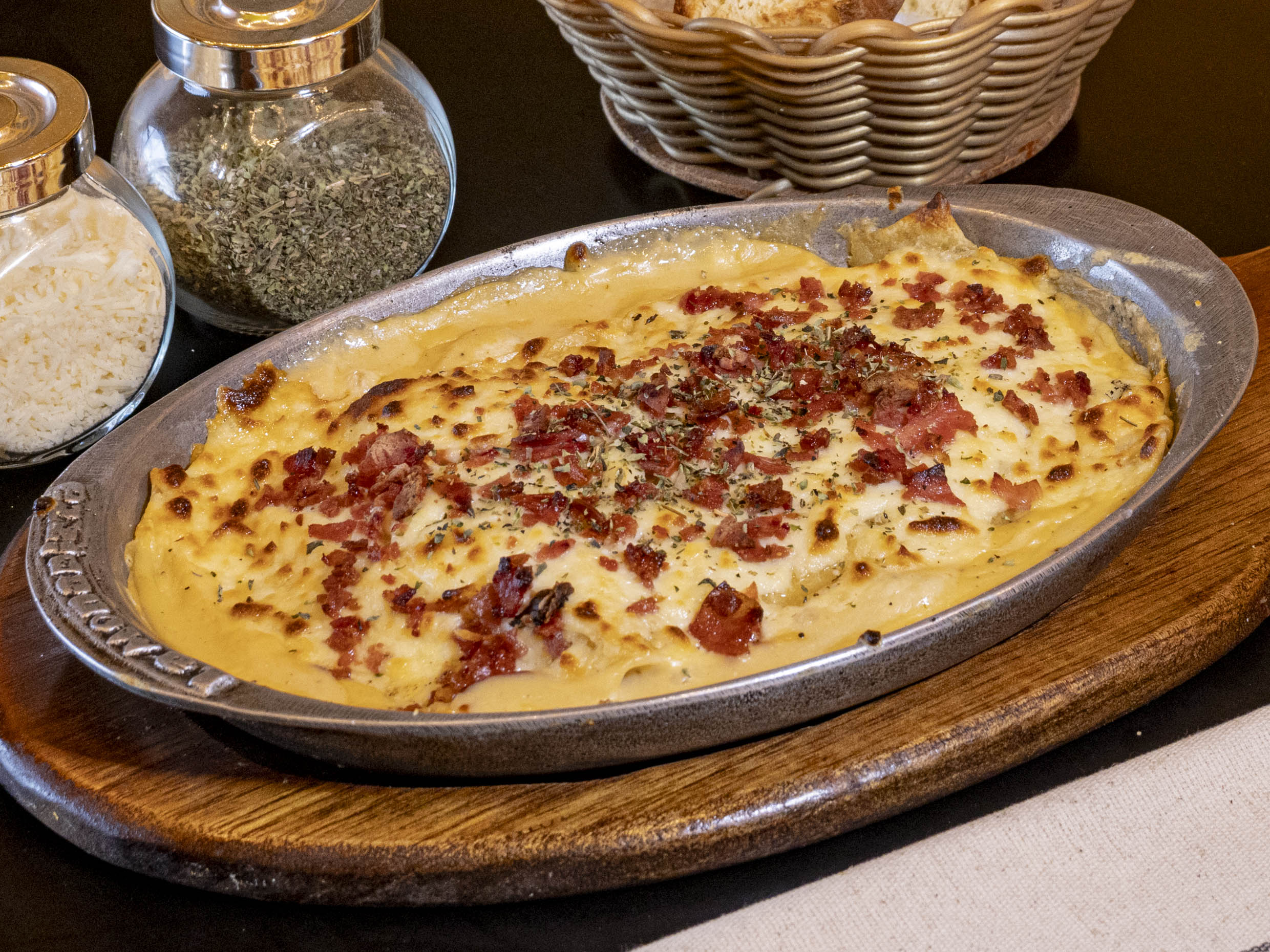 Salsa bechamel, champiñones, tocineta, cebolla, queso gratinado y perejil.