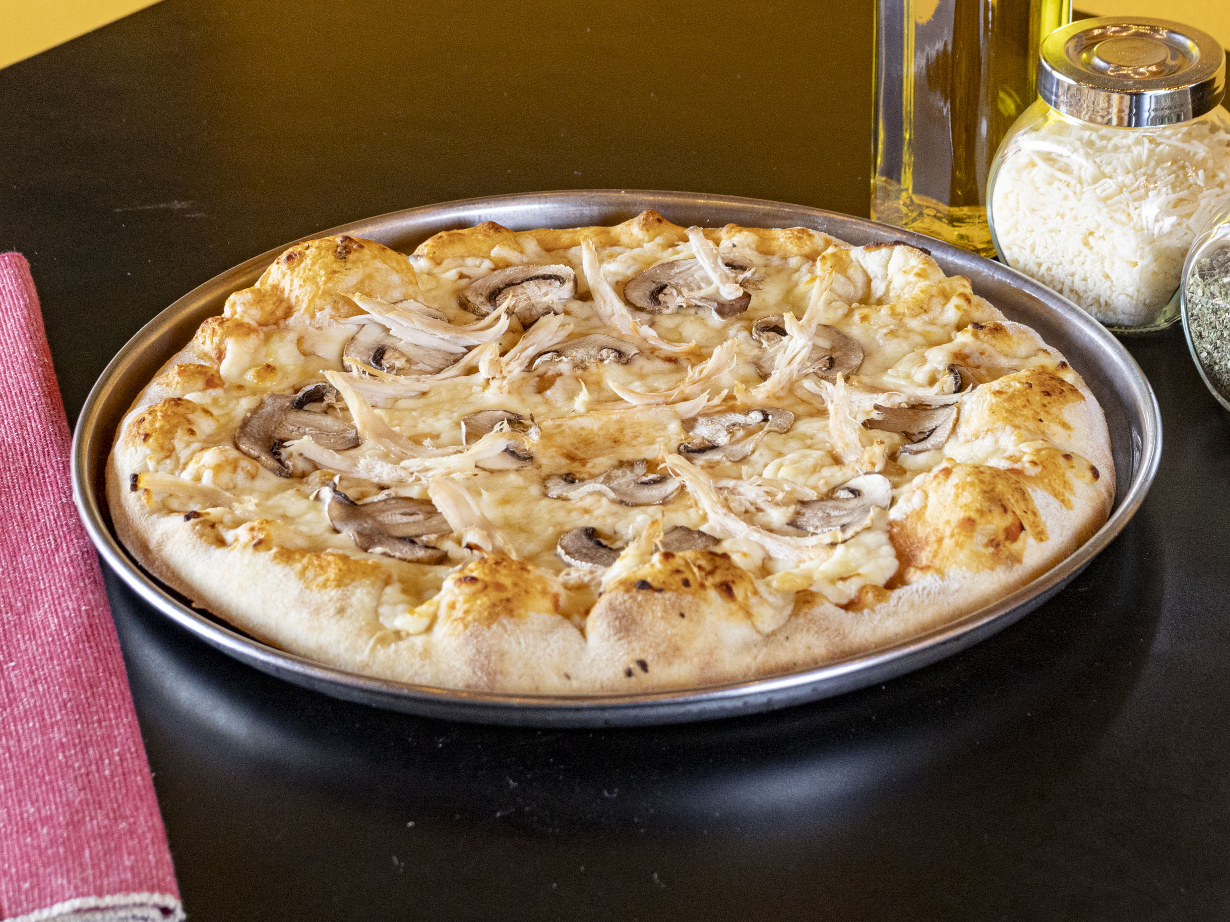 Pollo, champiñón, tocineta, salsa alfredo, y queso parmesano.