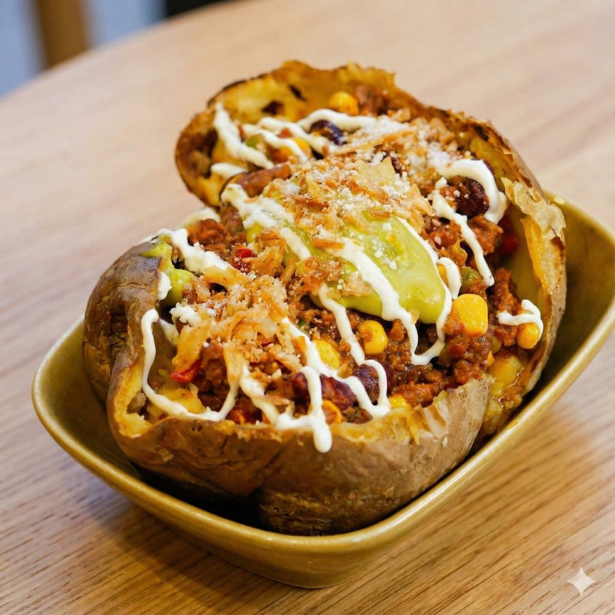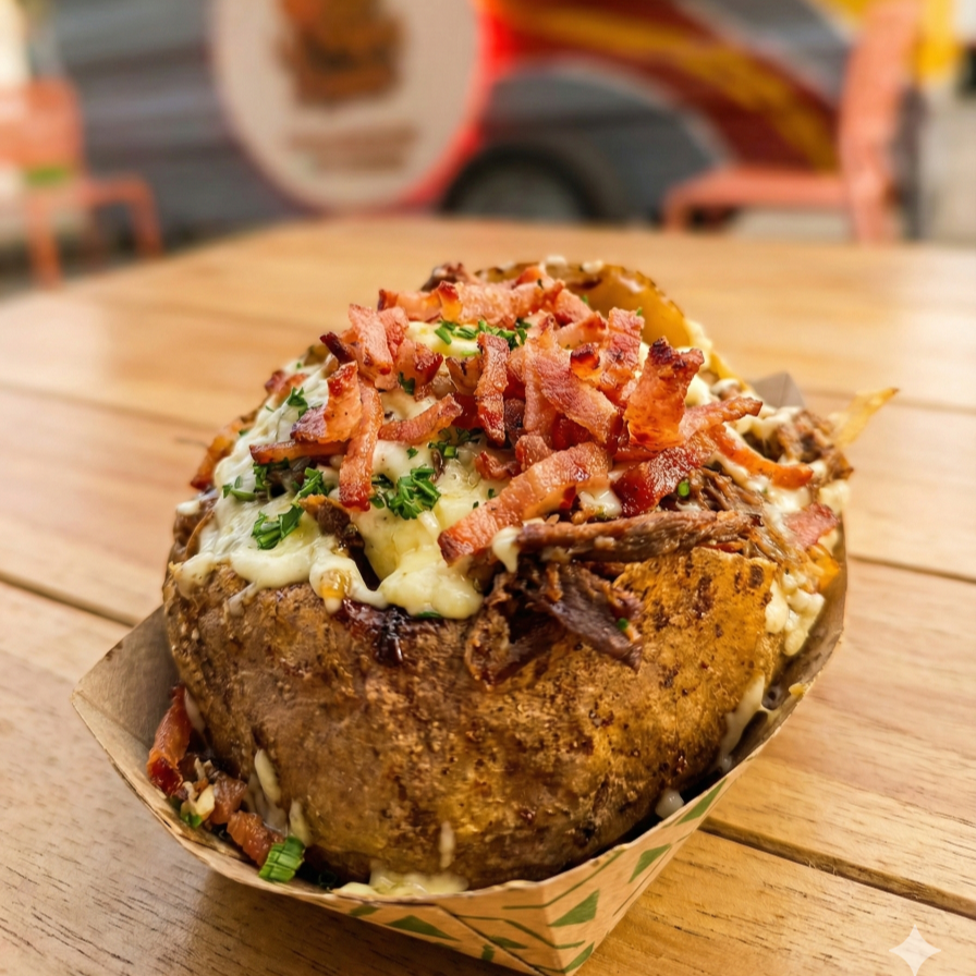 Papa horneada con trozos de chicharrón bien crocante, aguacate fresco en julianas y plátano maduro dorado. Un contraste de texturas perfecto que te encantará.
