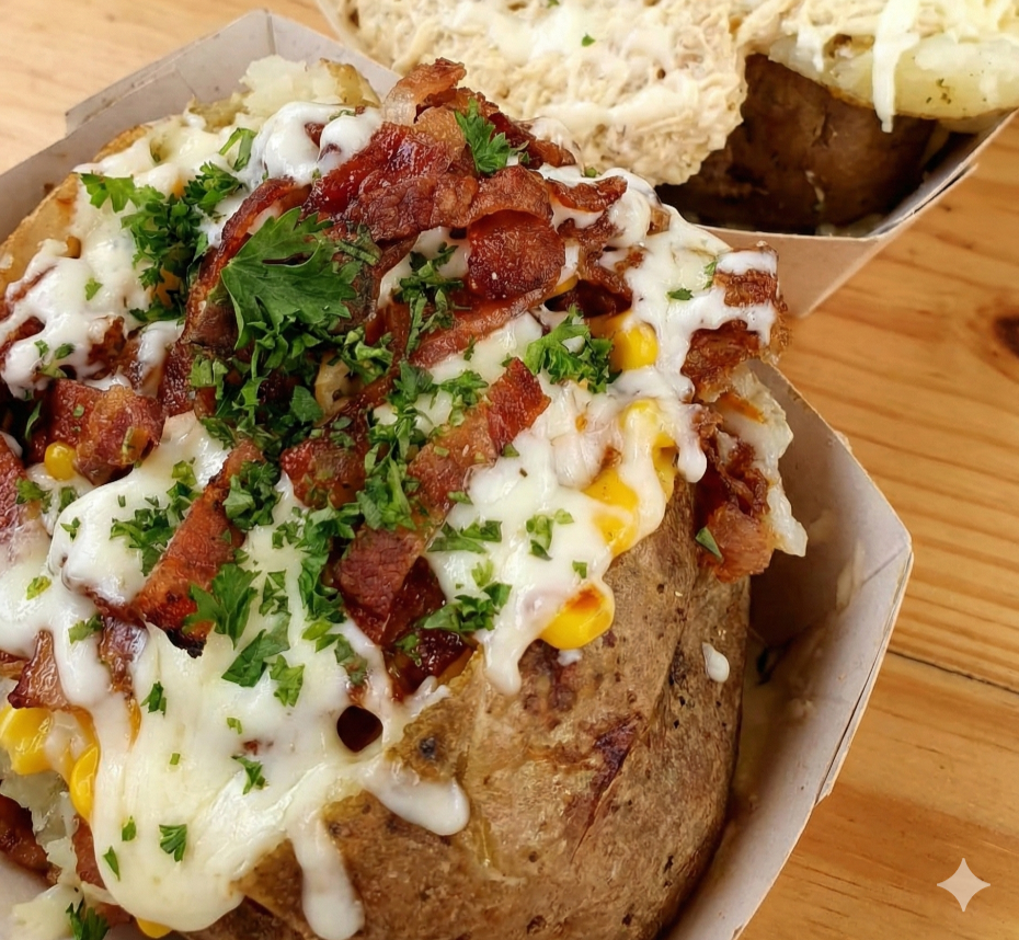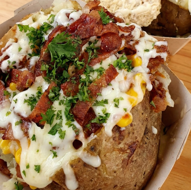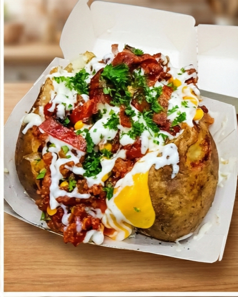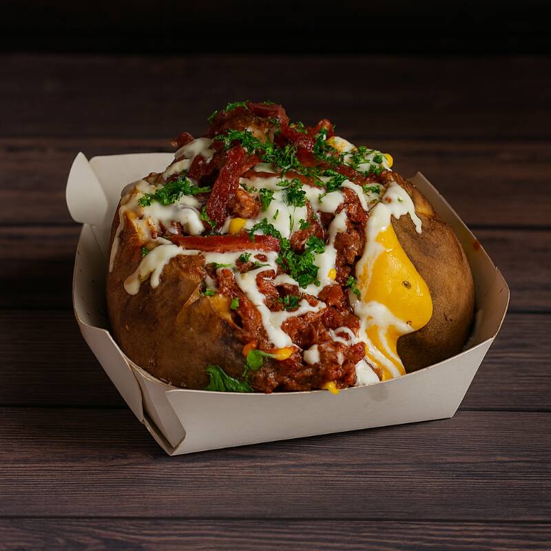 Papa horneada cubierta con una rica boloñesa casera de carne y tomate, enriquecida con maíz dulce que aporta un toque fresco y crocante en cada bocado.