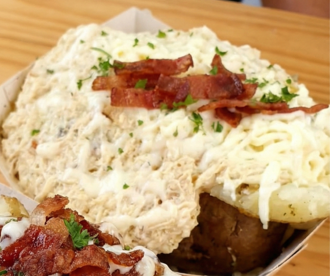 Papa horneada rellena de pollo jugoso salteado con ajo, vino blanco y finas hierbas, ligado con una crema suave y un toque especial de paprika.