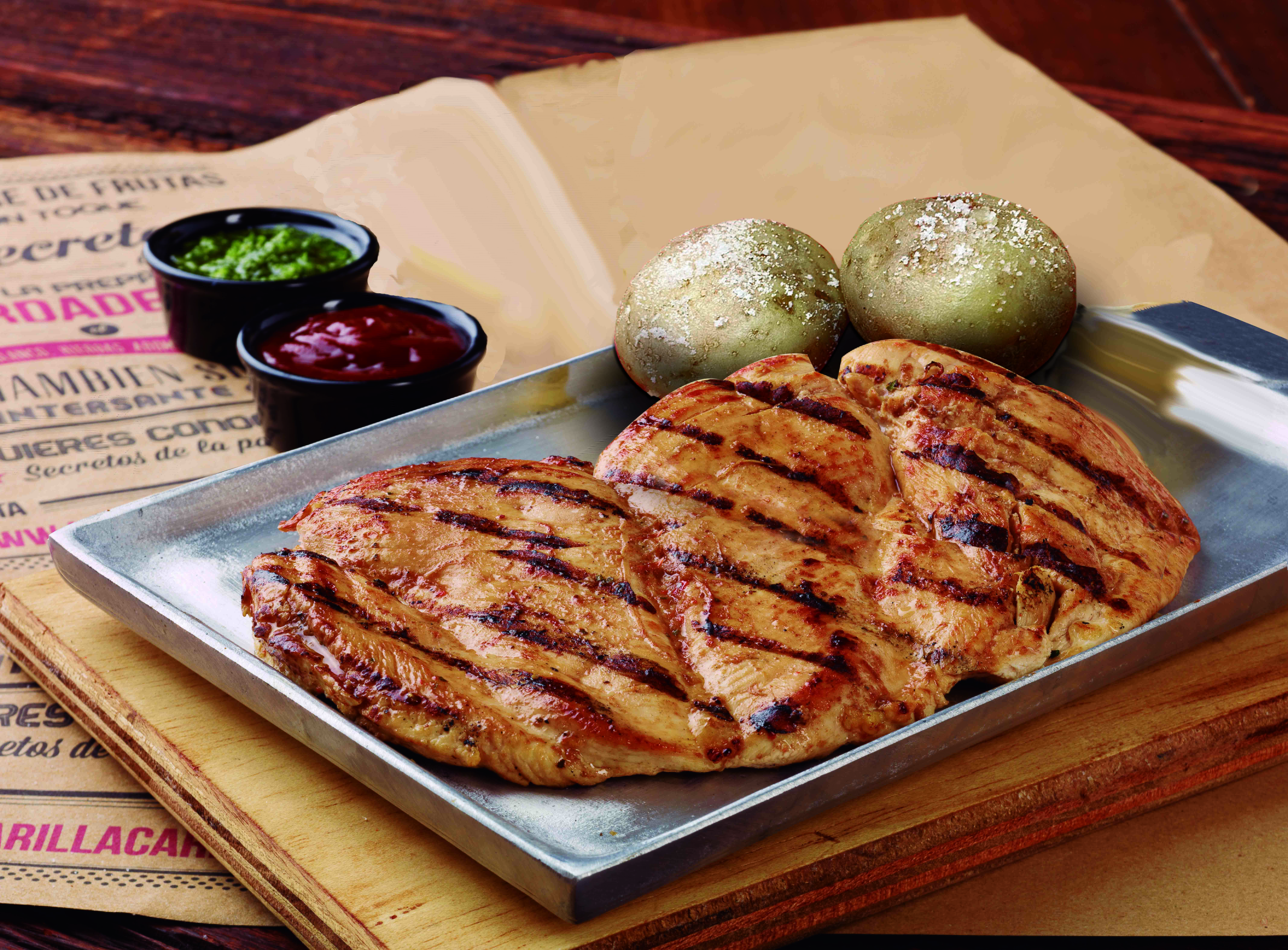 Corte abierto seleccionado de la pechuga de pollo 320 gr y 2 acompañamientos a elección.