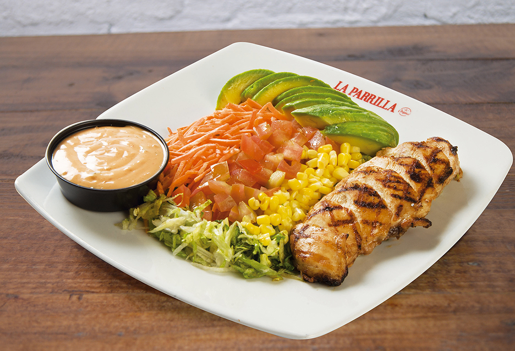 Fresca combinación de lechuga, tomate, zanahoria, maíz desgranado, aguacate y pechuga (160 gr) asada a la parrilla.