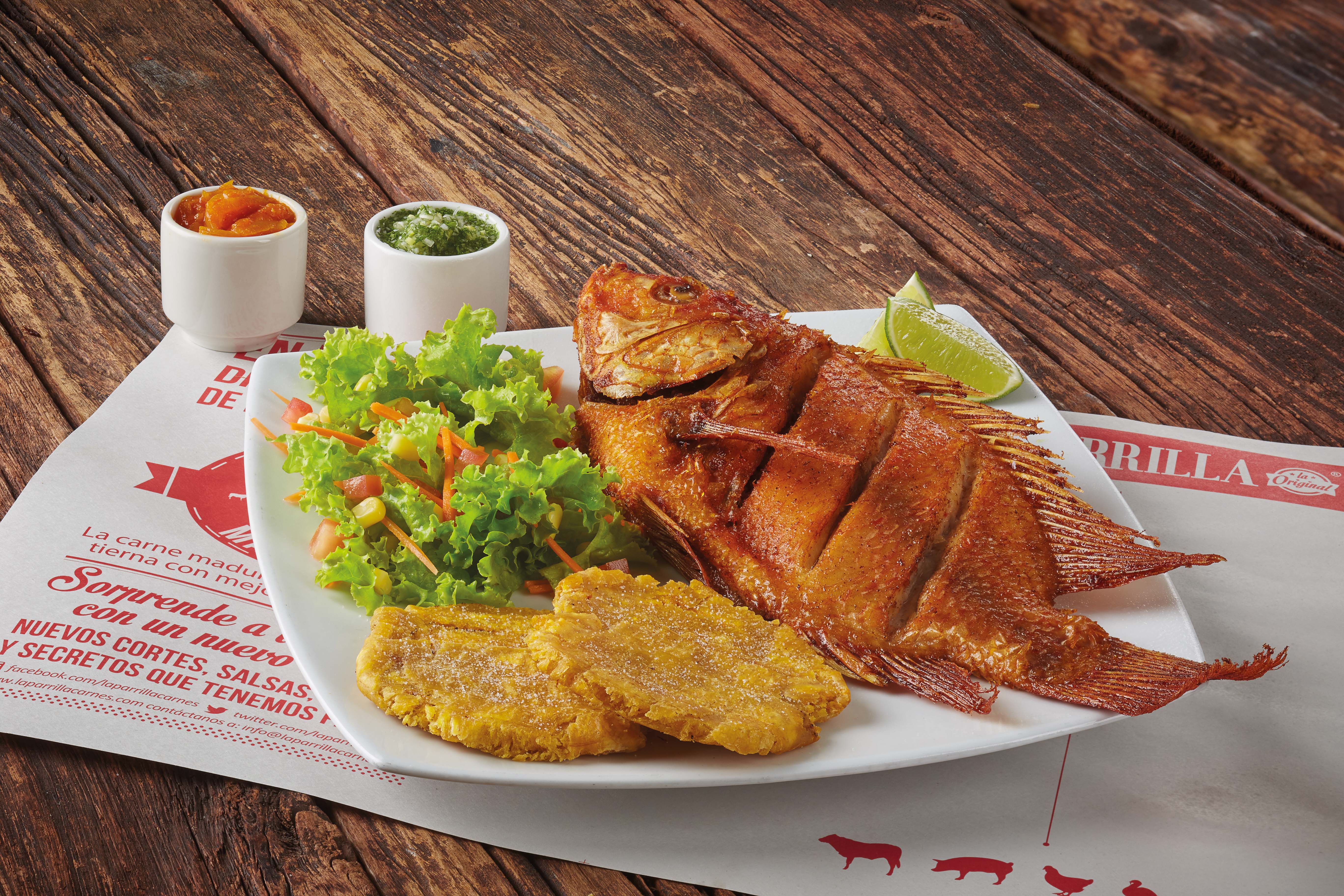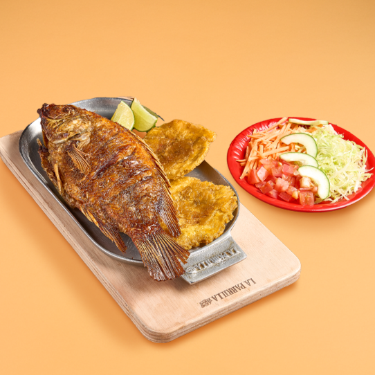 Mojarra entera frita acompañada de patacón y ensalada.